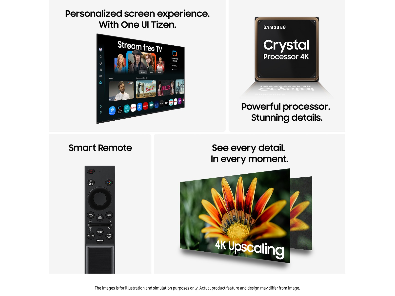 Samsung Daily+, Multi Control, Gaming Hub, Smarttelefon fjernstyrt, Støtte for SlimFit Cam, 7 år med Tizen OS oppgraderinger, Universal Guide, Samsung Knox Security, Gesture Control, Workout Tracker, Støtte for Apple AirPlay, Embeded POP, Wireless TV On, Klikk for å søke