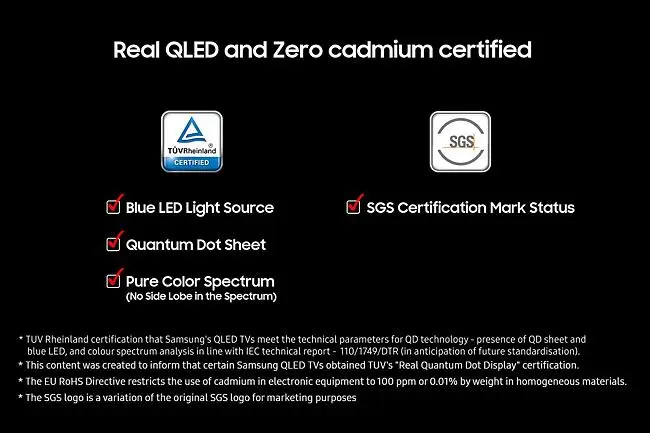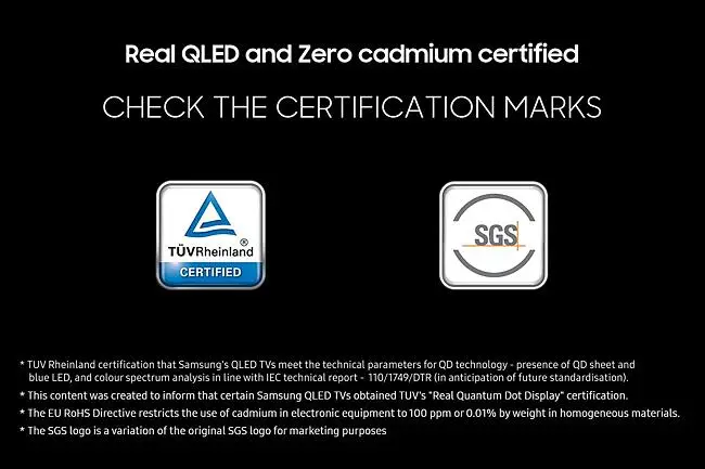 *Kadmium er et stoff som omfattes av EU-direktivet om begrensning av bruken av visse farlige stoffer i elektrisk og elektronisk utstyr (2011/65/EU). *TUV Rheinland-sertifisering som bekrefter at Samsungs QLED TV-er oppfyller de tekniske parameterne for QD-teknologi. De tekniske parameterne omfatter forekomsten av QD-sheets og blå LED, samt analyse av fargespekteret i samsvar med IECs tekniske rapport 110/1749/DTR (i påvente av fremtidig standardisering).