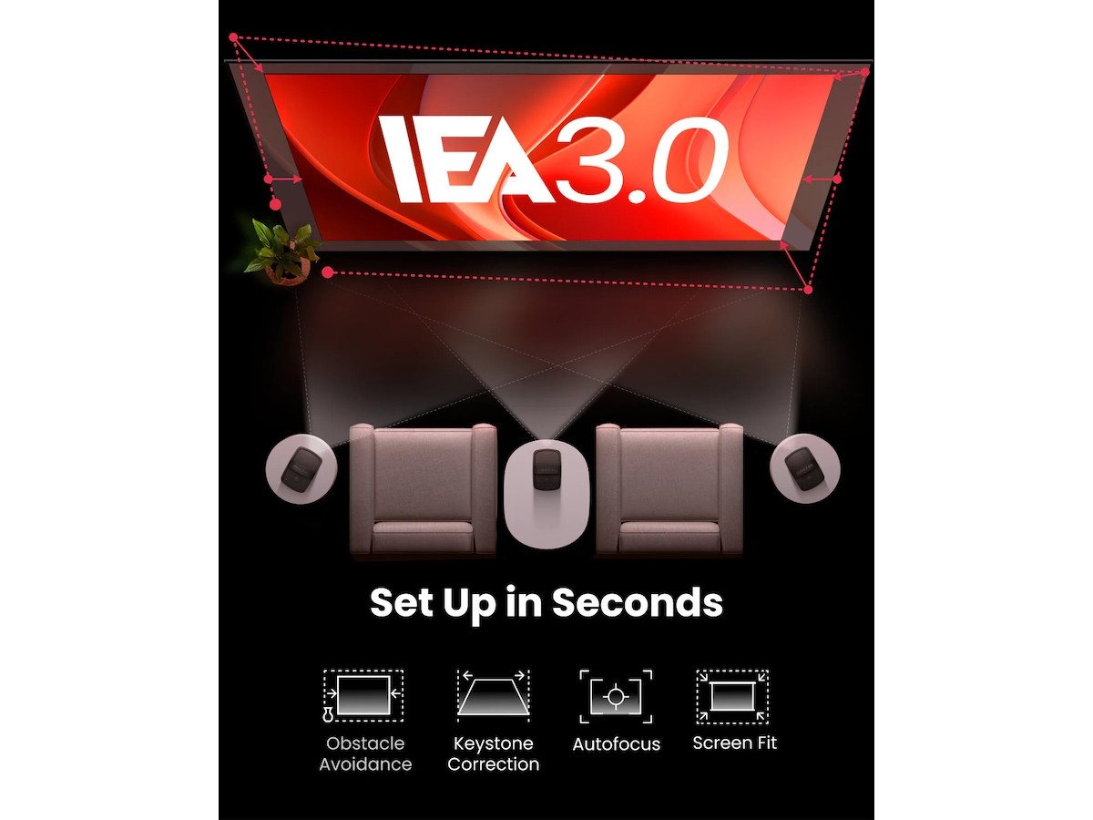Sett opp på sekunder: Vår intelligente miljøtilpasningsteknologi utfører skjermtilpasning, automatisk keystone-korreksjon, autofokus og hindringsunngåelse på bare 3 sekunder.
