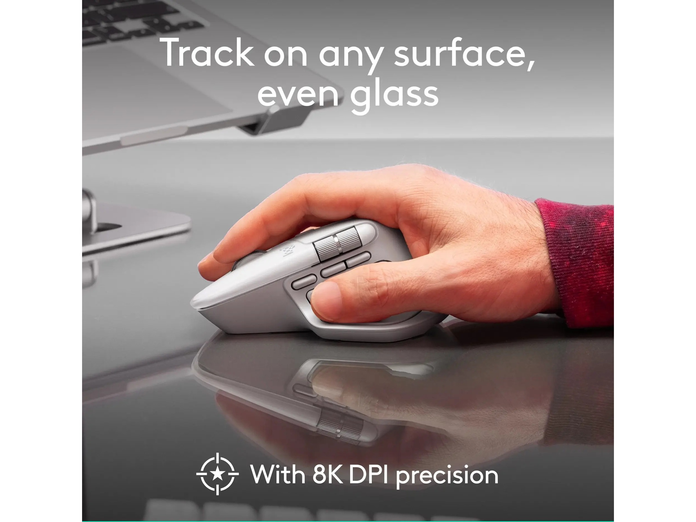 Egenskaper Actions Ring, Quiet Clicks-teknologi, MagSpeed-hjul, Tommelhjul, 4 mm glasstykkelse, Haptisk tilbakemelding, Horisontal rulling, Logitech Darkfield Laser Tracking