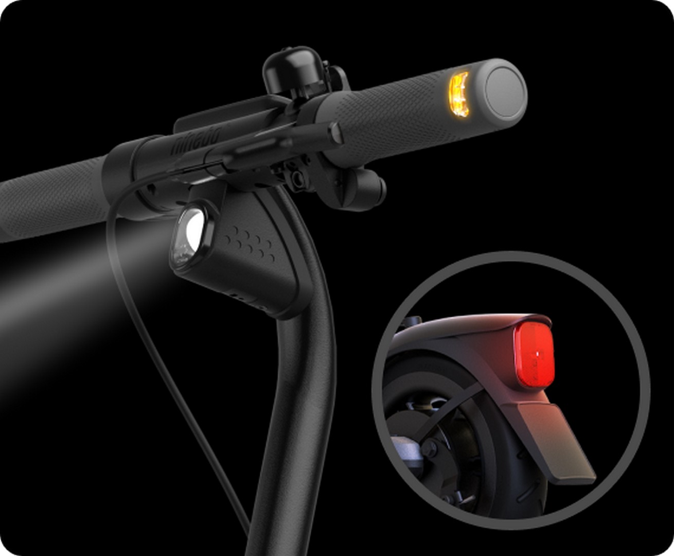 E2 E II har et 2,1W frontlys som gir synlighet opptil 13,5 meter under dårlige lysforhold. Integrerte blinklys og bakbremselys øker synligheten for andre trafikanter og reduserer kollisjonsrisikoen.