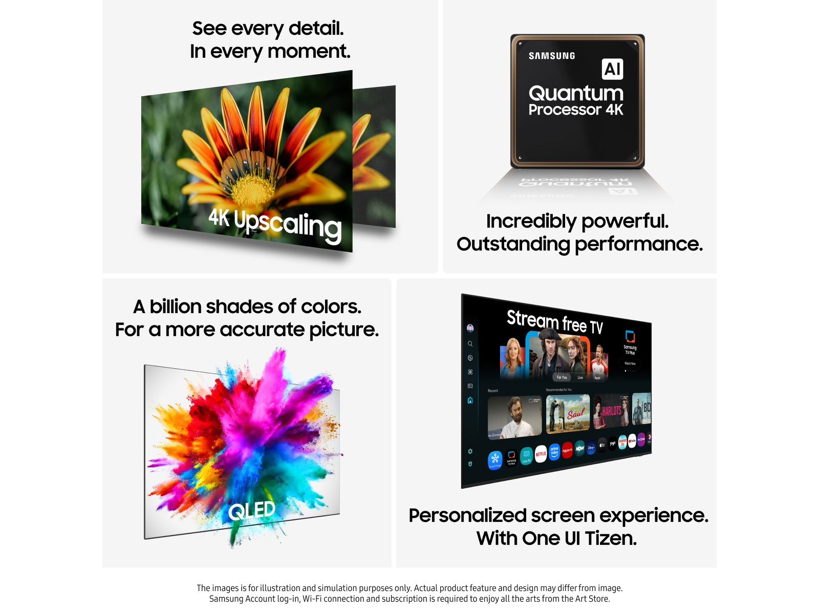 Embeded POP, Samsung Vision AI, Wireless TV On, 7 år med Tizen OS oppgraderinger, Gaming Hub, Støtte for SlimFit Cam, Samsung Knox Security, Universal Guide, Workout Tracker, Smarttelefon fjernstyrt, Samsung Health, Samsung Daily+, Gesture Control, Støtte for Apple AirPlay