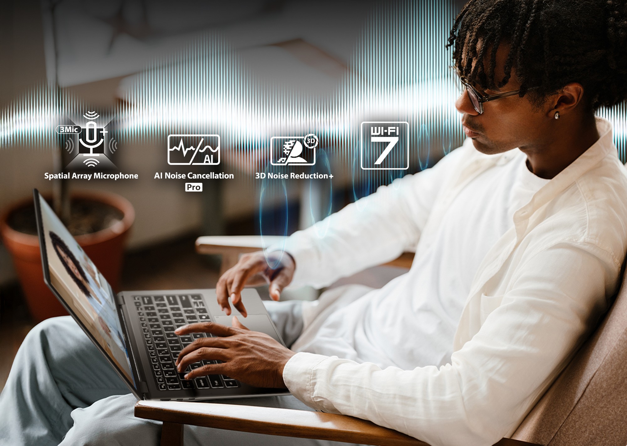 3D-støyreduksjonskamera forbedrer videoklarhet i lavlysomgivelser, og holder bildene skarpe og naturlige selv i bevegelse. Samtidig fokuserer avansert AI-støyfiltrering på stemmen din mens den minimerer bakgrunnsforstyrrelser, og sikrer at hvert møte høres klart, selvsikkert og virkelig ansikt til ansikt.