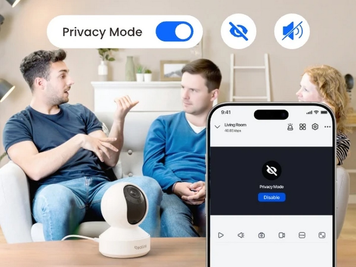 Bare trykk for å aktivere personvernsmodus når overvåking ikke er ønsket. Slå umiddelbart av direktestrøm, varsler og video-/lydopptak – uten å koble fra kameraet.