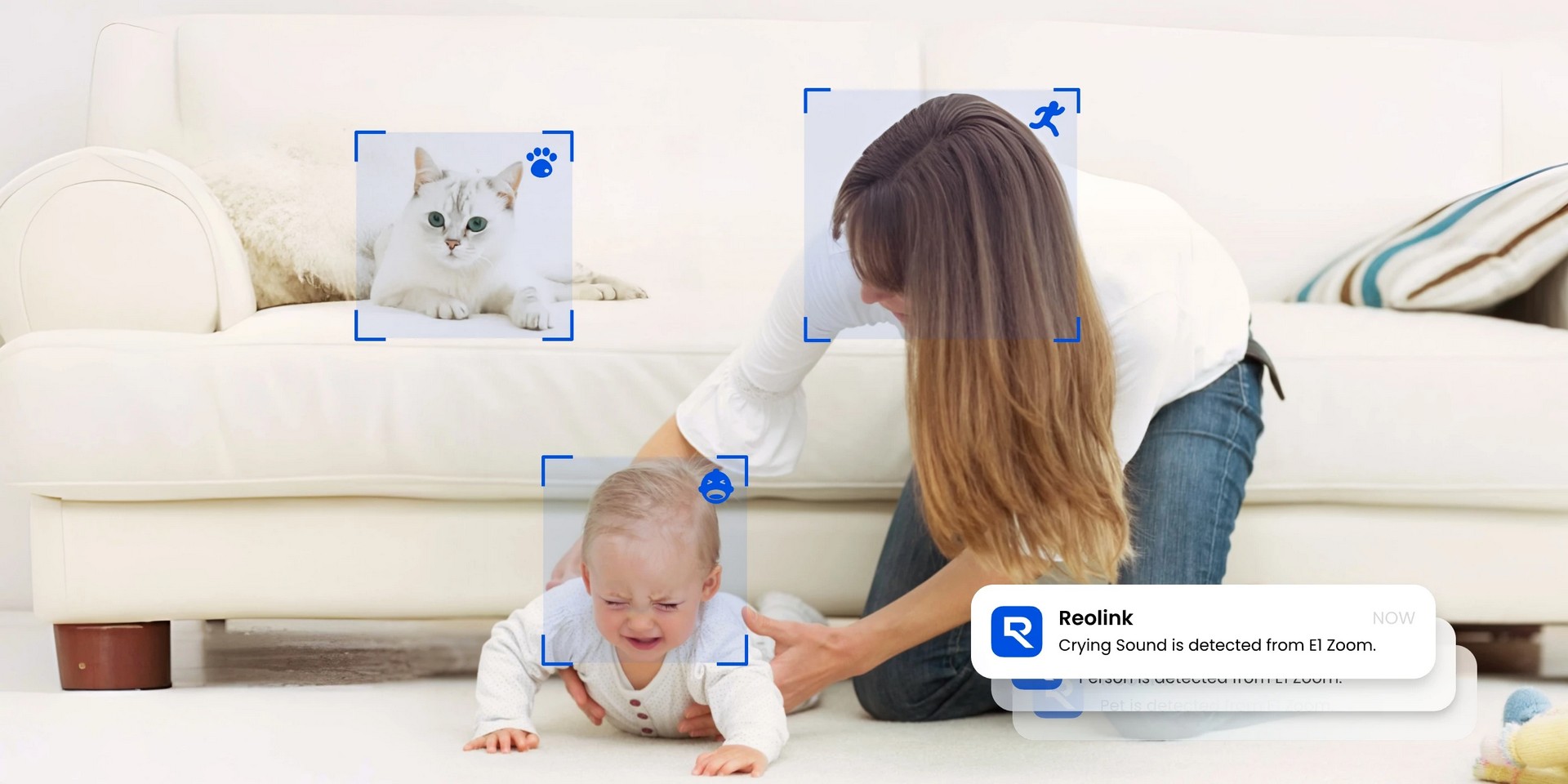 Med smart deteksjon av personer, kjæledyr og gråtelyder holder du oversikt over det som betyr mest. Få umiddelbart vite når babyen trenger deg, selv når du er utenfor hørevidde, uten å måtte sjekke hele tiden. Drevet av lokal AI-teknologi forblir dataene dine sikre og private til enhver tid.