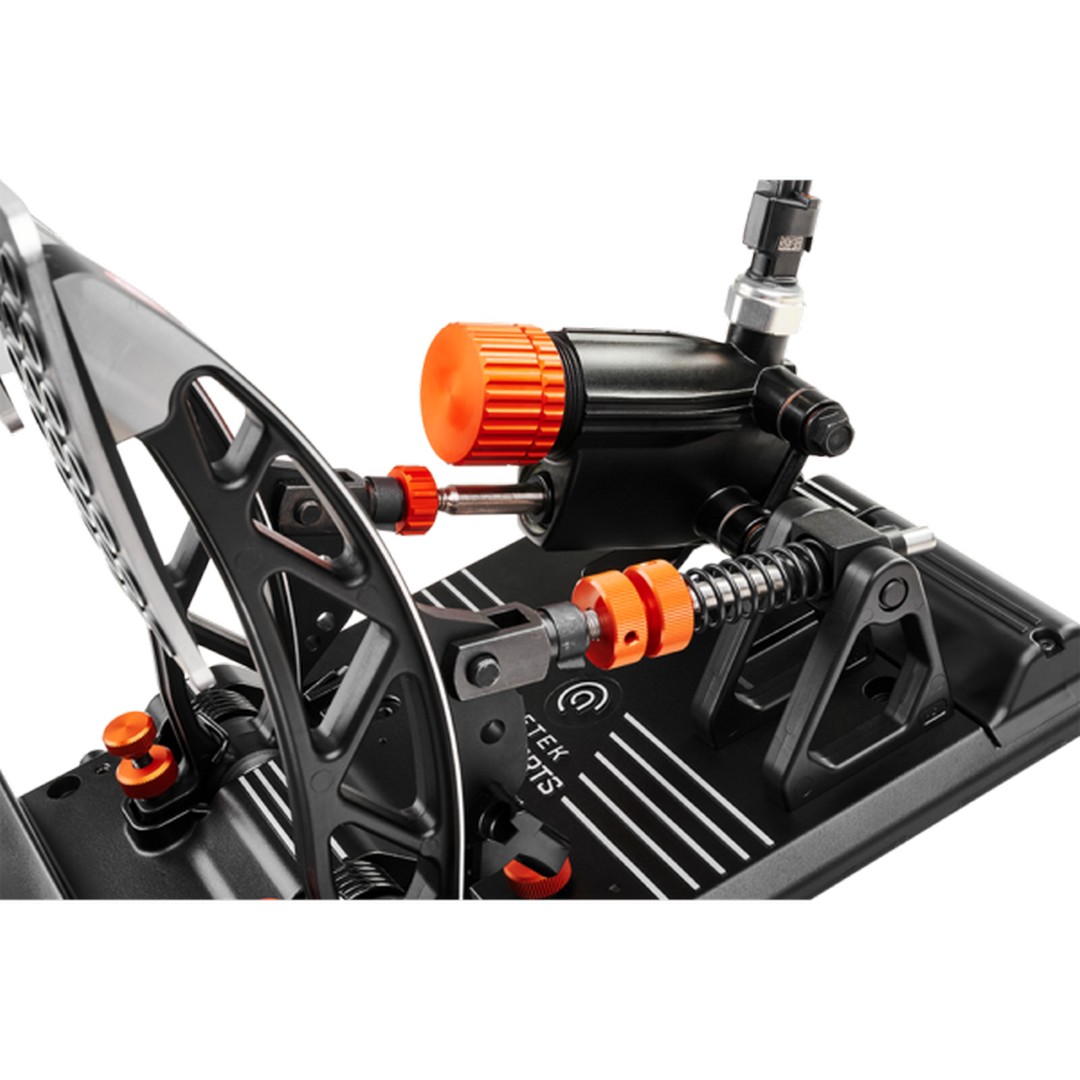 T.H.O.R.P.-systemet: Når slavesystemet er mekanisk låst, har du 100 % samme følelse som i en racebil når bremseklossene er fullt presset mot bremseskiven, og musklene dine presser direkte mot de hydrauliske kreftene. Dette er IKKE simulert – dette er den samme, identiske følelsen som i en racebil, og du kan fortsette å trykke på pedalen opp til et hydraulisk trykk på 100 bar, som tilsvarer 185 kg trykk på pedalplaten – det samme som en ekte F1-bil!