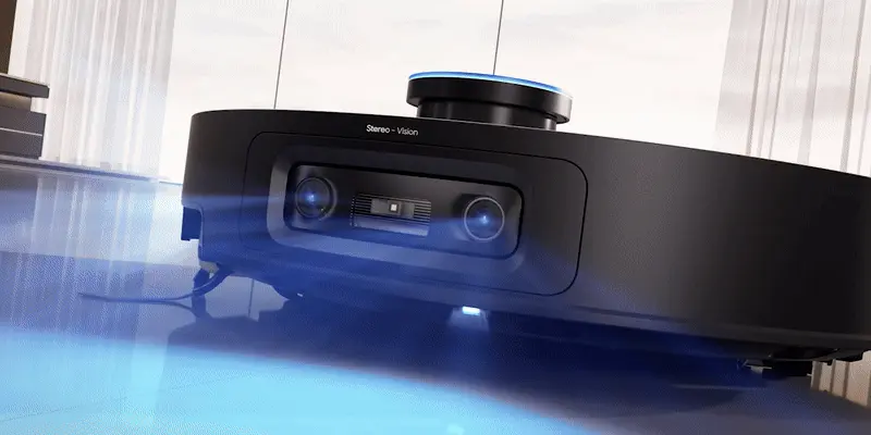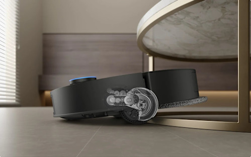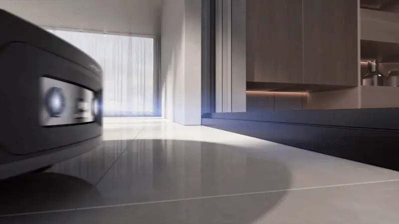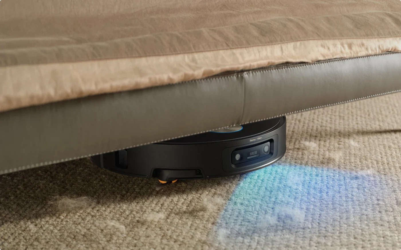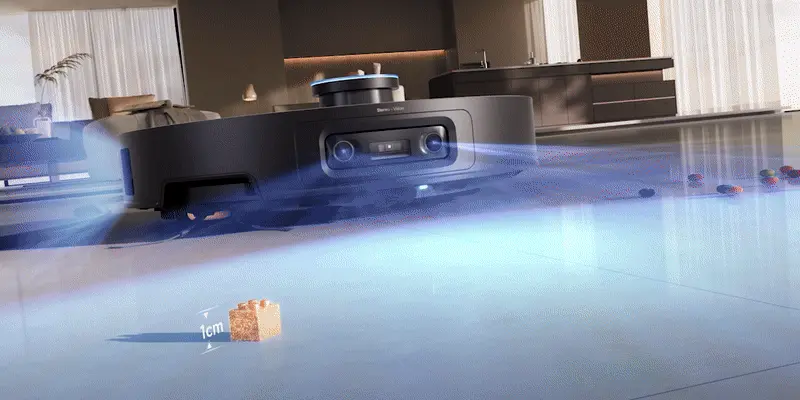 I åpne rom holdes sensoren hevet for full 360° skanning av hjemmet og rask, nøyaktig kartlegging. Når roboten beveger seg inn i lave områder, senkes sensoren og navigasjonen overtas av to AI-kameraer som tar RGB-bilder for å bygge en tredimensjonal forståelse av omgivelsene, selv i trange områder.