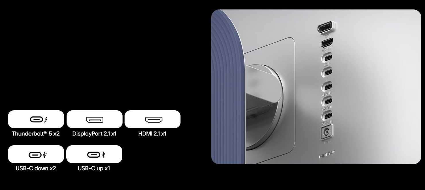 Forbedre arbeidsflyten med Thunderbolt™ 5 på 6K-skjermer. Thunderbolt™ 5 sikrer kompatibilitet med neste generasjon og støtter viktige arbeidsflyter sømløst med dobbelt så rask** overføring, 6K-daisychain og DisplayPort 2.1-båndbredde. For skapere, redigerere og kunstnere som bruker kunstig intelligens, gir den enkel tilkobling og fleroppgavekjøring med solid ytelse og skalerbarhet. I tillegg støtter 96 W strømlevering rask og pålitelig lading for økt produktivitet. Det er alt du trenger for å bygge en fremtidsklar arbeidsflyt med maksimal effektivitet.