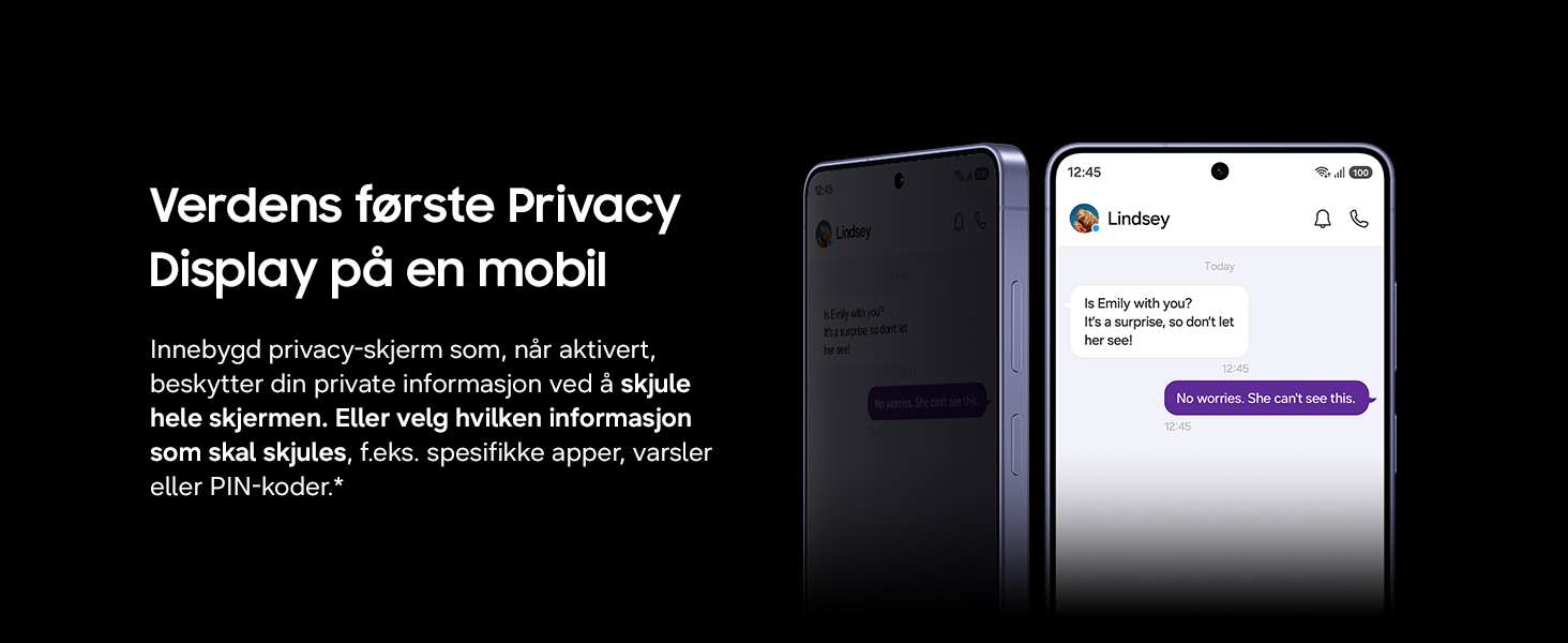 Med et enkelt trykk kan du styre hvem som ser skjermen din.⁸ Velg mellom fire nivåer av innsynsbeskyttelse og bestem selv når det skal aktiveres. I offentlige miljøer, som i en heis, merker mobilen automatisk når du vil ha skjermen helt privat.