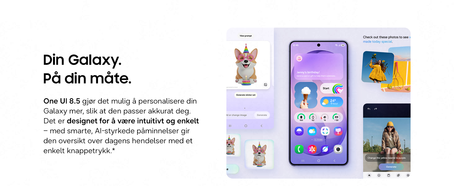 Galaxy AI¹ og One UI 8.5 lærer seg vanene dine og fremhever det som er viktigst for deg. Du kan enkelt velge hva som skal vises på låseskjermen og gjøre mobilen helt personlig.