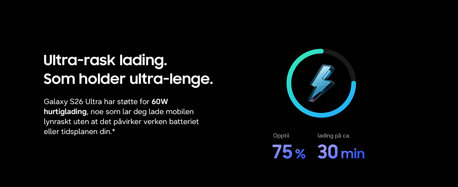 Nå hurtiglader du Galaxy S26 Ultra til 80 % på bare 30 minutter – med 60 W hurtiglader⁶. Eller uten ledninger – med 25 W trådløs hurtiglading⁶.
