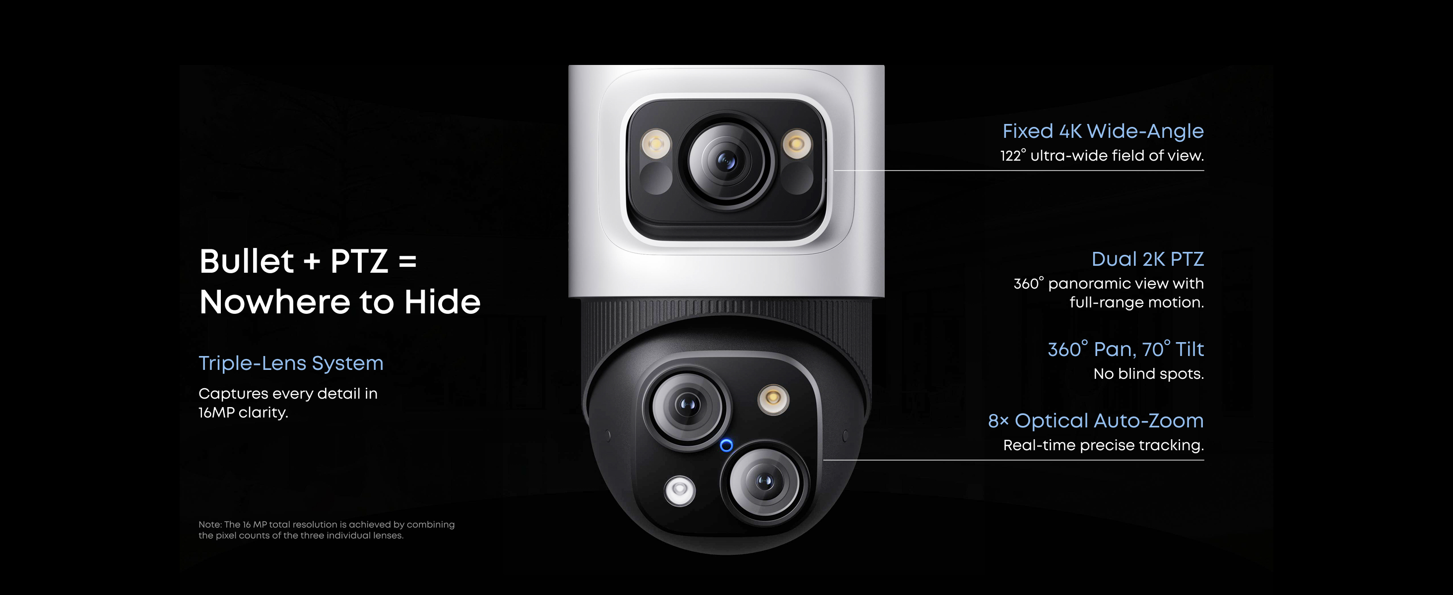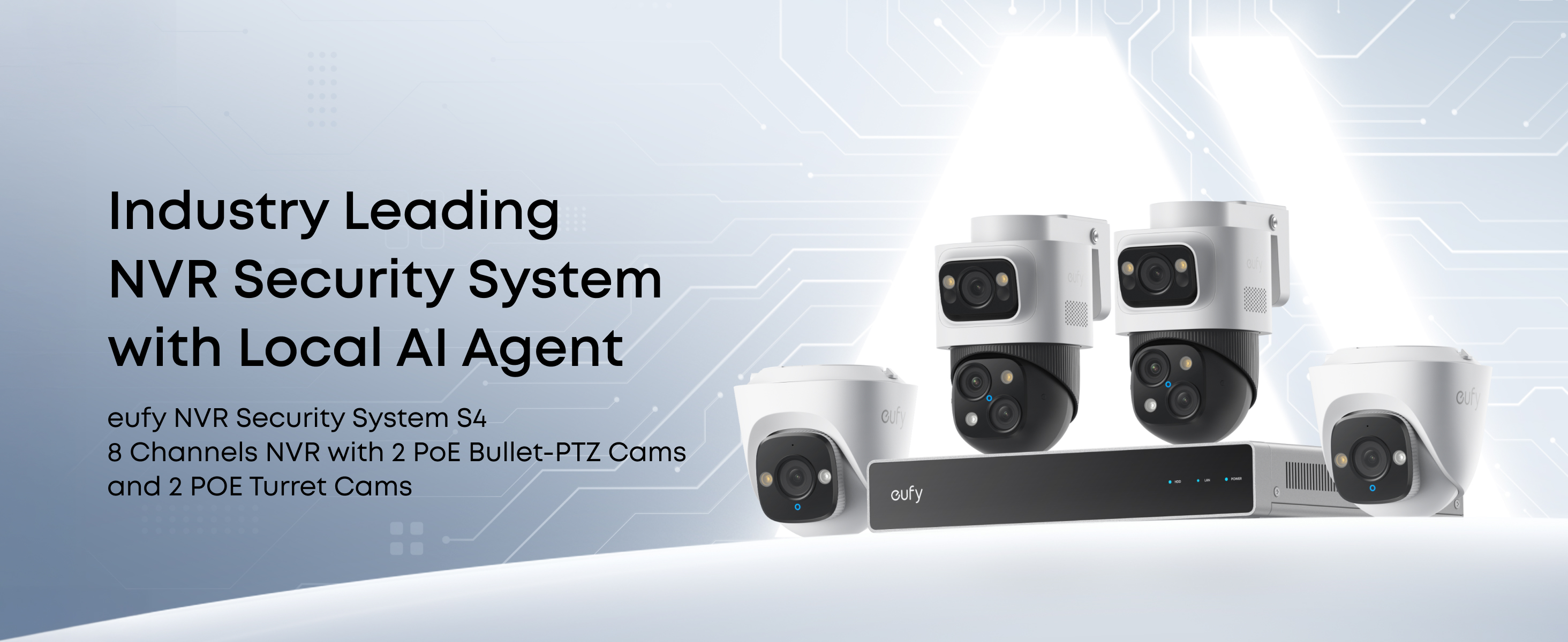Eufy 4-Cam PoE Security System gir profesjonell beskyttelse med avansert teknologi. Med to faste 4K turret-kameraer for kritiske områder, to 4K bullet-PTZ-kameraer for bred dekning og et 2K 360° PTZ-kamera med 8× zoom, elimineres alle blindsoner.