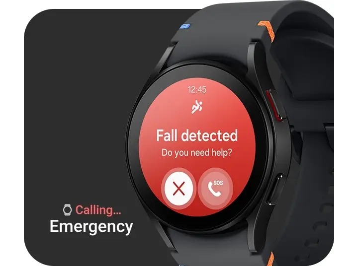 ** Galaxy Watch FE må ha den nyeste Wear OS-versjonen installert.** Funksjonen Registrer fall må være aktivert på Samsung Galaxy Wearable-appen på Samsung Galaxy-smarttelefonen for å bruke Fall Detection på klokken.*** Nødanrop krever nettverkstilkobling eller sammenkobling med Samsung Galaxy-smarttelefon.**** Informasjon samlet fra klokken, Samsung Health-appen eller relatert programvare er ikke ment å diagnostisere, kurere, lindre, behandle eller forhindre sykdom eller andre tilstander.***** Bilde simulert for illustrative formål. Faktisk UX/UI kan være annerledes.*
