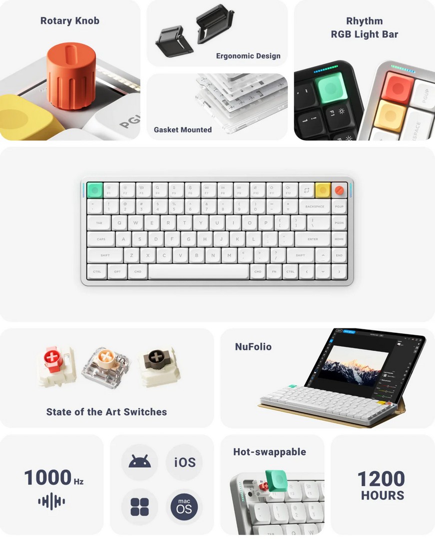 Verdens mest elskede lavprofil-tastatur er tilbake, med noen millimeter mindre i midjen, men forbedringer på nesten alt annet. Bryterne har nå like lang vandringslengde som høyprofilbryterne, og batteriet varer mye lenger. Det er en ny farge, flere lys og mer fargerike lys. Og ja, en ny knott når du trenger mer dreiing enn trykking. Vil du låse opp flere hemmelige krefter? Ikke glem å sjekke ut NuPhyIO 2.0 for å superlade din Air75 V3 enda mer.