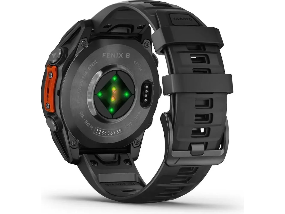 Utvid grensene dine med Garmin fēnix 8. Denne sportklokken er Garmins tøffeste fēnix-modell hittil: den er vanntett til 100 meter og dykkbar til 40 meter. Få tilgang til avanserte styrketreningsplaner og sportspesifikke treningsøkter for mange ulike idretter og aktiviteter – alt for å hjelpe deg med å øke kroppens utholdenhet og ytelse. Fēnix 8 har en lys AMOLED-skjerm som gjør detaljert informasjon lettlest, og med den innebygde høyttaleren og mikrofonen kan du ta imot samtaler direkte i klokken (når den er parkoblet med smarttelefonen din). Andre flotte funksjoner er blant annet innebygd LED-lommelykt, musikklagring, Garmin Pay kontaktløse betalinger, smarte varsler og mer.