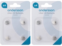 Andersson LR44 er et lite knappcellebatteri med lang levetid som brukes i fjernkontroller, klokker, termometre, kalkulatorer, Game & Watch-spill og mer. Denne pakken inneholder fire LR44 1,5 volts alkaliske knappcellebatterier.