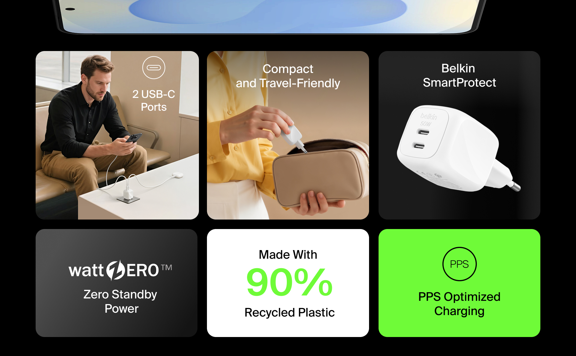 Gi enhetene dine lynrask og effektiv lading med Belkin BoostCharge Pro – en vegglader som kombinerer 50W GaN-teknologi med et kompakt og reiseklart design. Perfekt for deg som vil ha én lader til alt: mobil, nettbrett, laptop, ørepropper og smartklokke.