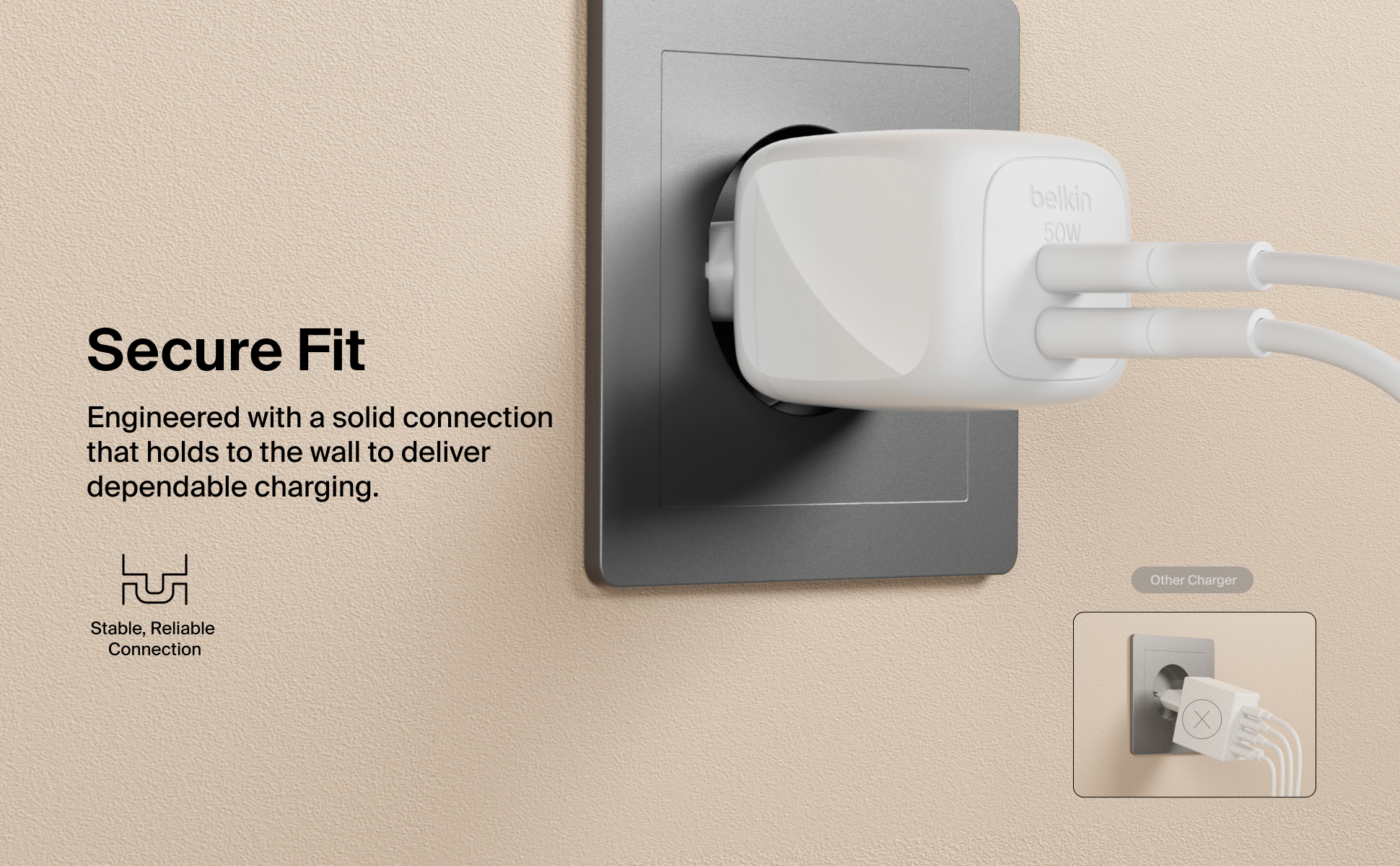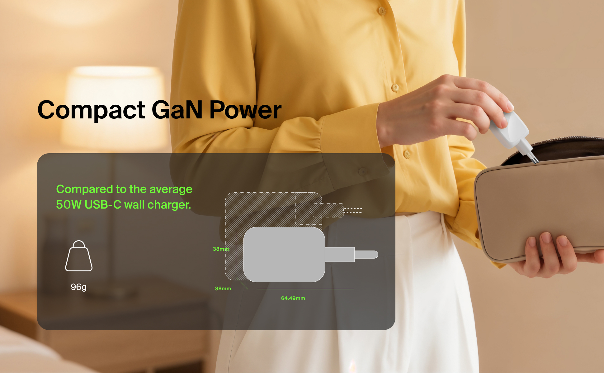 Med avansert GaN-teknologi får du høy effekt i et lite format. Laderen leverer opptil 50W via én USB-C-port, eller 25W + 25W når begge portene brukes samtidig. Det betyr rask og effektiv lading for flere enheter samtidig.
