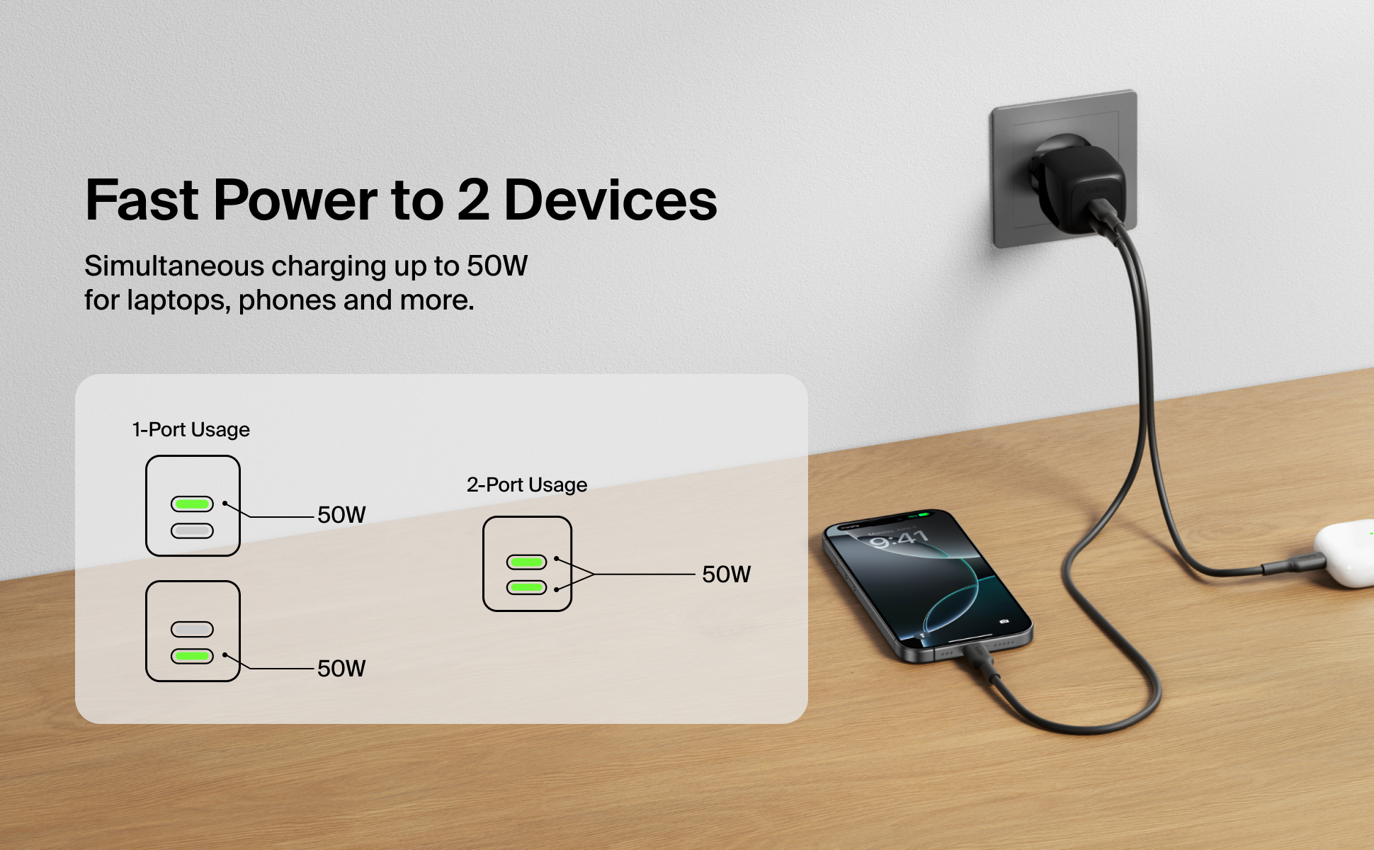 Med avansert GaN-teknologi får du høy effekt i et lite format. Laderen leverer opptil 50W via én USB-C-port, eller 25W + 25W når begge portene brukes samtidig. Det betyr rask og effektiv lading for flere enheter samtidig.