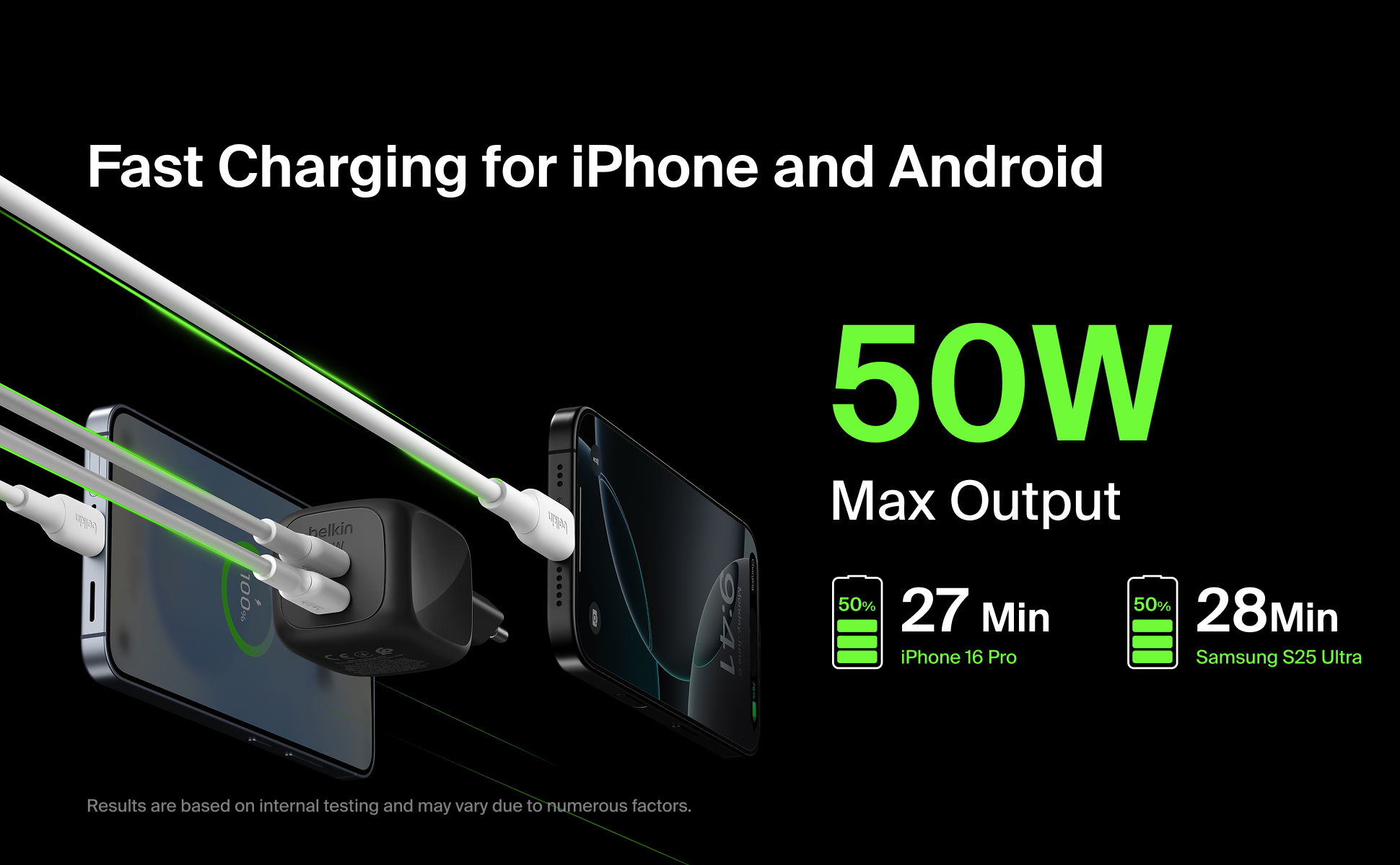 Hurtiglader iPhone 16 fra 0–50 % på 25 minutter† og MacBook 2021 fra 0–50 % på 30 minutter†