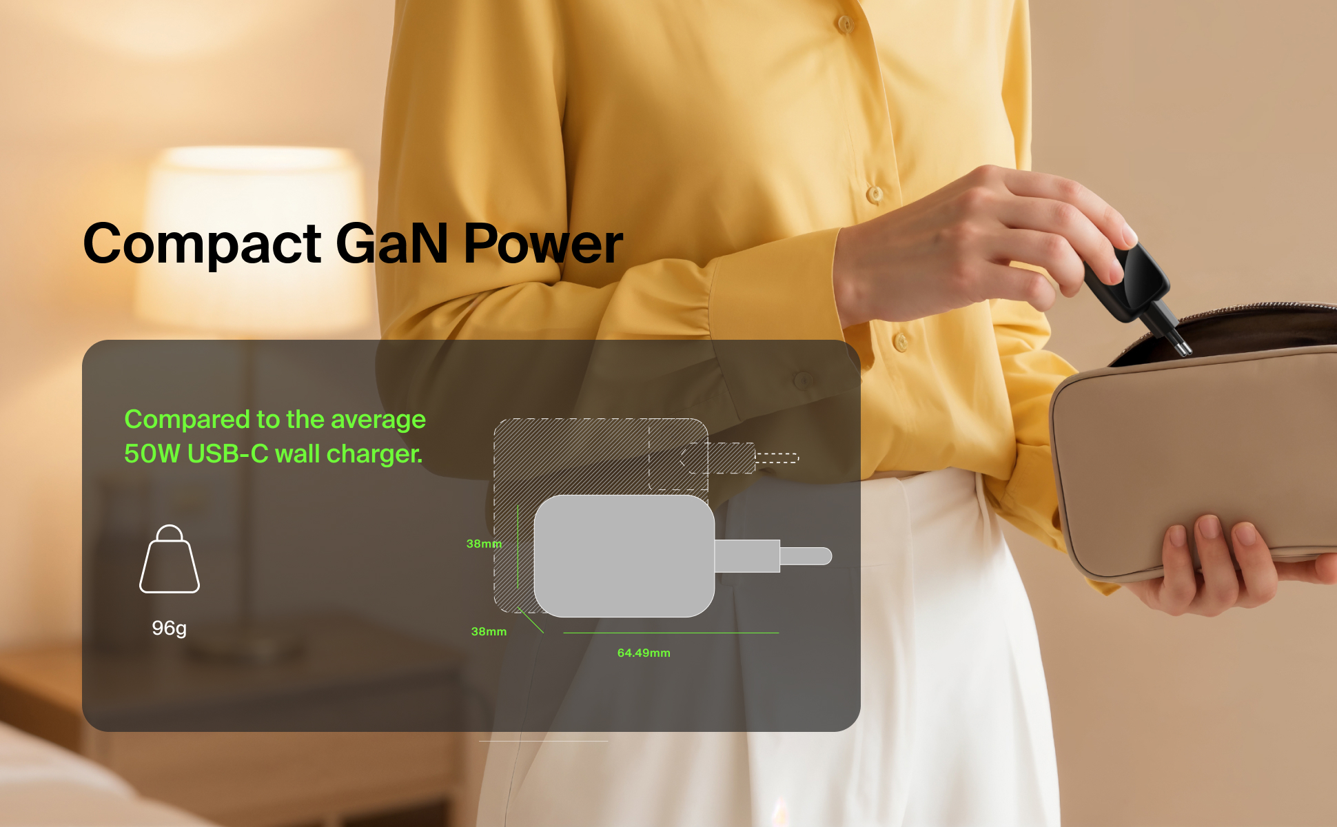 BoostCharge Pro er lett og kompakt, med en vekt på kun 89 g og måler 38 x 38 x 46 mm – liten nok til å passe i lommen og perfekt for reiser.