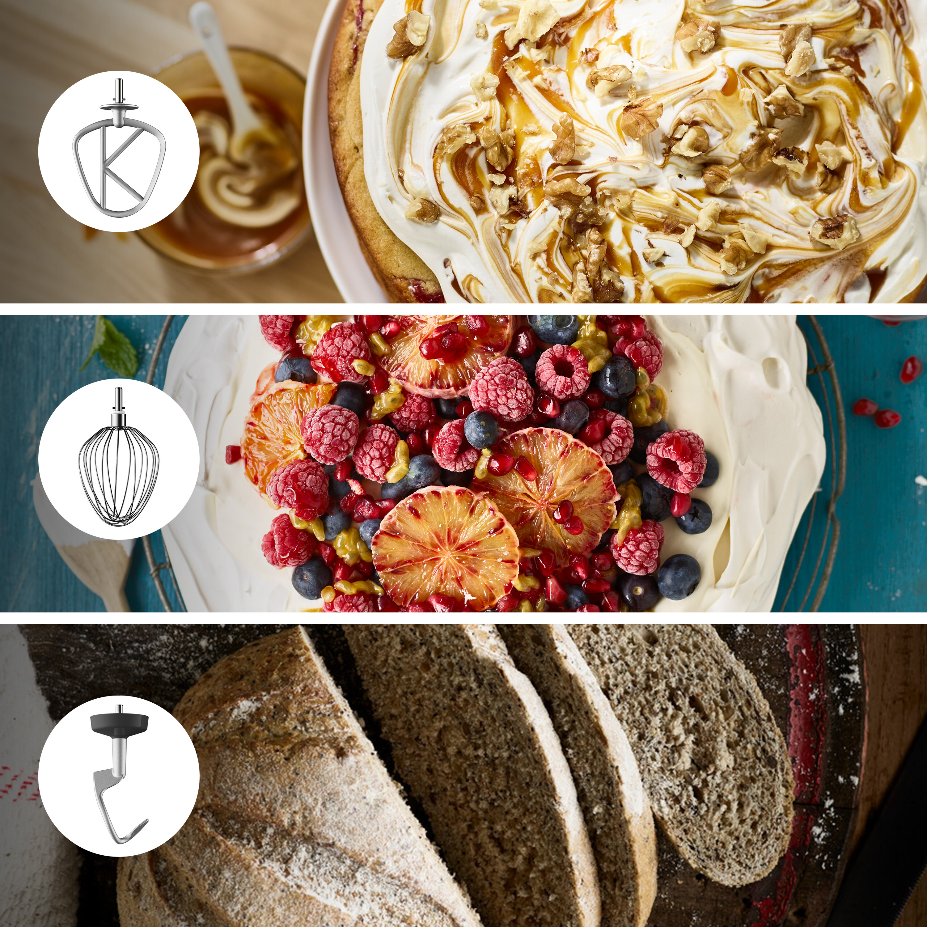 Den store 6,7 liters bollen gir god plass til både små og store oppskrifter, perfekt for baking og matlaging til hele familien. Maskinen leveres med deigkrok, visp og K-spade, som sikrer optimal bearbeiding av alle typer ingredienser – enten du elter, blander eller pisker.