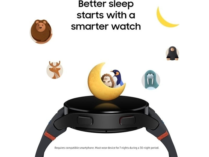 *** Krever Samsung Health-applikasjonsversjon 6.24 eller nyere.** Galaxy Watch FE må være sammenkoblet med en Samsung Galaxy-smarttelefon med Android 11.*** Søvnsporingsfunksjoner er kun ment for generelle velvære- og treningsformål. Ikke beregnet for å påvise sykdom, gi diagnose eller behandling av noen medisinsk tilstand eller søvnforstyrrelse. Målene er kun for din personlige referanse. Ta kontakt med en lege for råd.**** Søvncoaching krever søvndata på minst 7 dager, inkludert 2 dager fri.***** Bilde simulert for illustrative formål. Faktisk UX/UI kan være annerledes.**