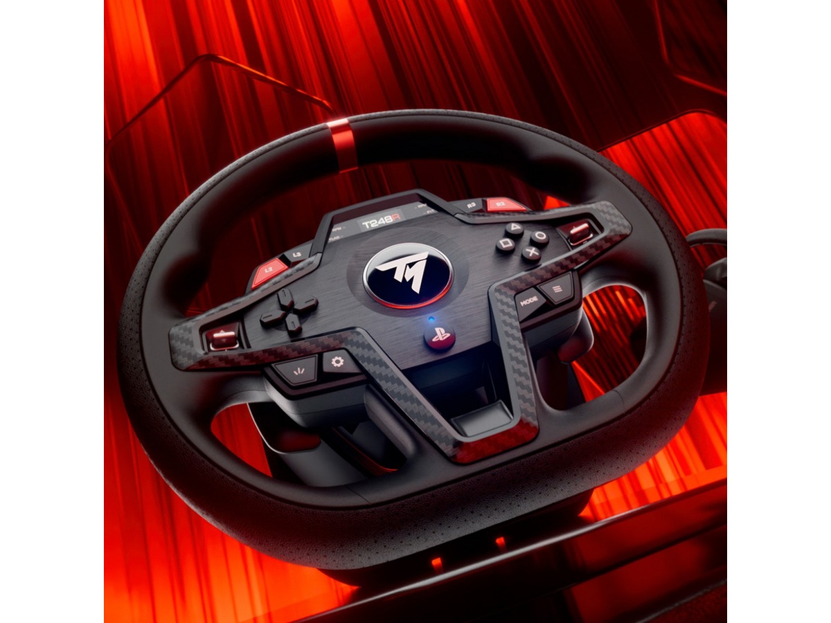 T248R benytter det avanserte T-HD (Hybrid Drive) Force Feedback-systemet, som gir 3,1 N⋅m dreiemoment og jevn 48 W effekt for dynamisk, realistisk kjøring. Den ergonomiske, allsidige rattkransen måler 28 cm i diameter og har 25 handlingsknapper, inkludert 2 doble kodere. Rattet har et moderne design med perforert lær og imitasjon av karbon. Den integrerte fargeskjermen (LCD) tilbyr over 20 visningsalternativer og 4 LED-lys, som gir sanntids telemetri og mulighet for å justere rattinnstillinger underveis. T-MP girspaker med Mag-Shift-sensorer gir umiddelbare og presise girskift. T3PM pedalsettet, utstyrt med Hall Effect (H.E.A.R.T.) sensorer, sikrer presise innspill og tilbyr 4 justerbare bremsetrykkmoduser for optimal kontroll.