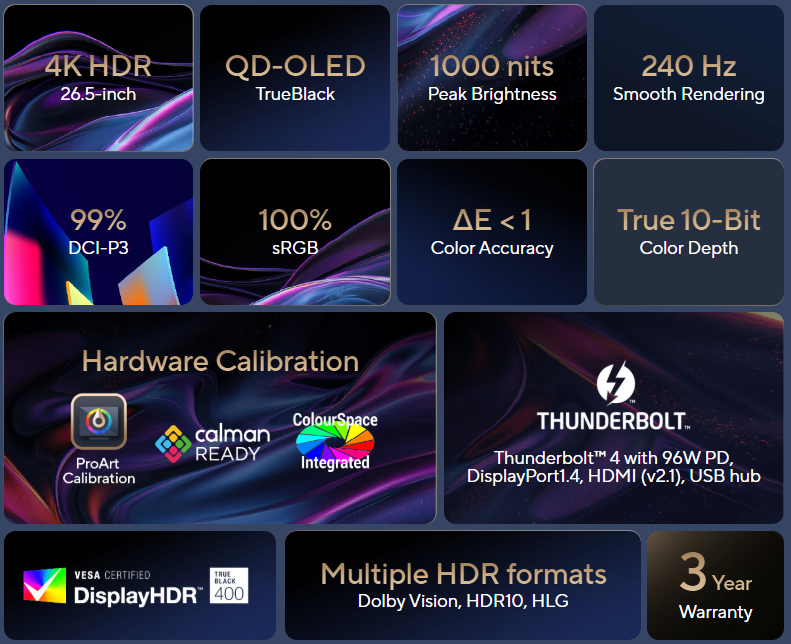 ProArt Display OLED PA27UCDMR er en profesjonell skjerm designet for profesjonelle innholdsskapere. Denne 26,5-tommers 4K HDR-skjermen har et banebrytende 1000-nits QD-OLED-panel med 99 % DCI-P3-spekter, som sikrer svært nøyaktige farger og eksepsjonelt detaljerte bilder. Oppdateringsfrekvensen på opptil 240 Hz gjør det mulig for skapere å utvikle spill med rask gjengivelse og utføre kvalitetskontroller av kunstverk på én enkelt skjerm. I tillegg gjør støtten for flere HDR-formater PA27UCDMR til den perfekte skjermen for arbeid med raskt bevegelig HDR-innhold.