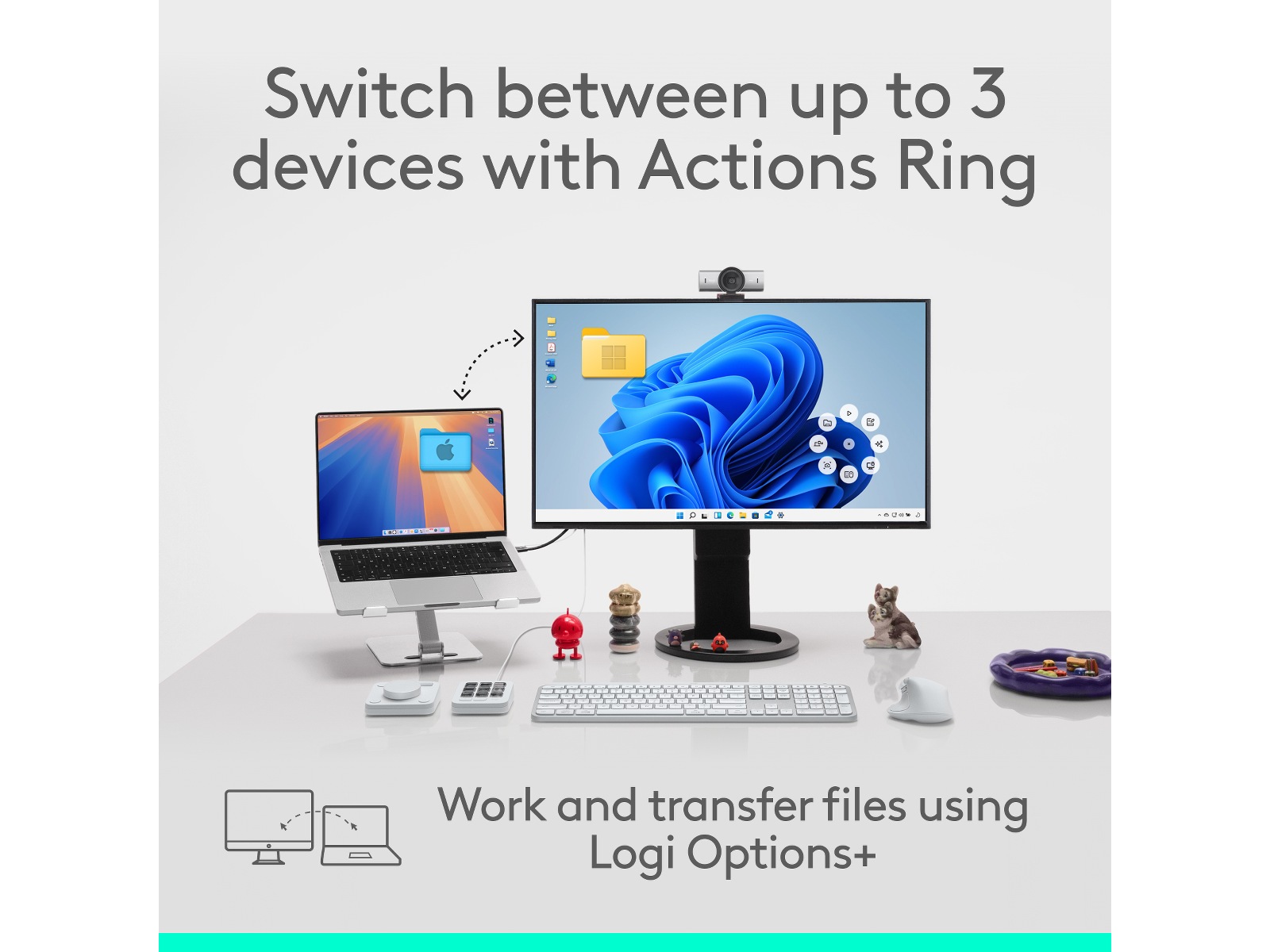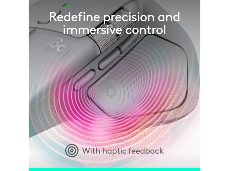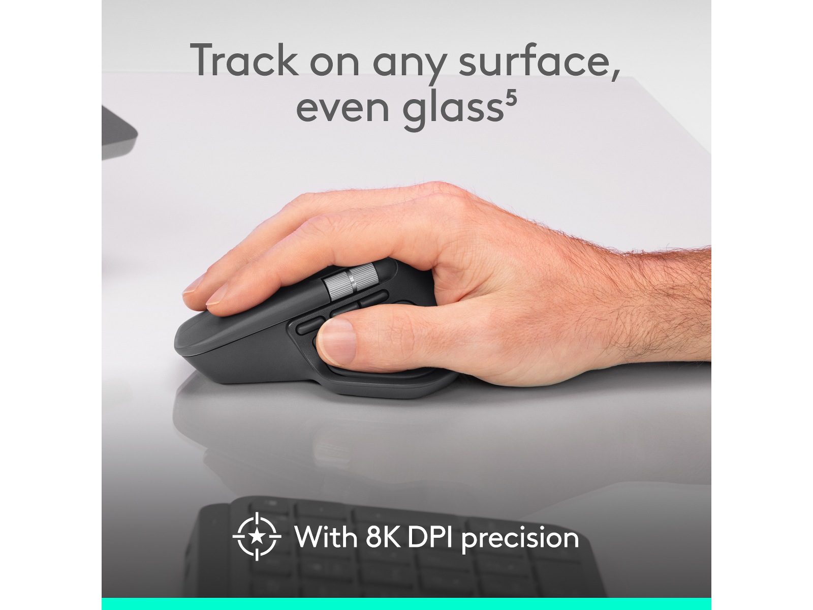Egenskaper Tommelhjul, 4 mm glasstykkelse, Quiet Clicks-teknologi, Haptisk tilbakemelding, MagSpeed-hjul, Actions Ring, Logitech Darkfield Laser Tracking, Horisontal rulling