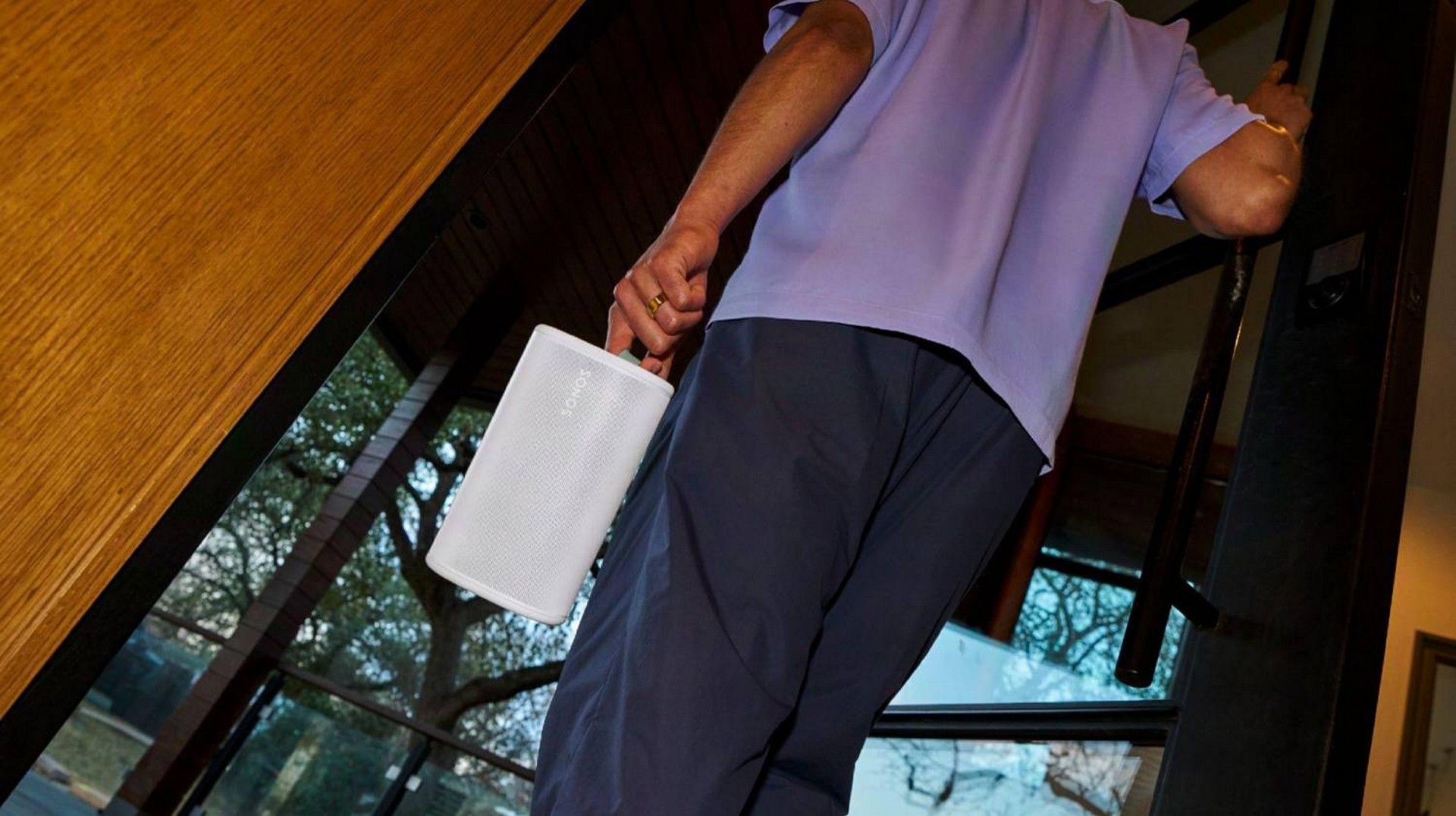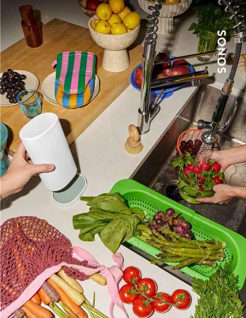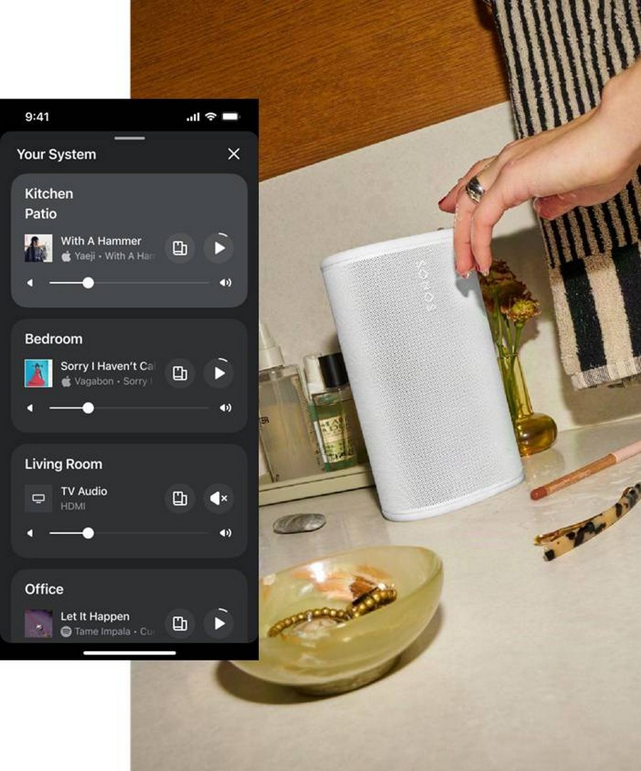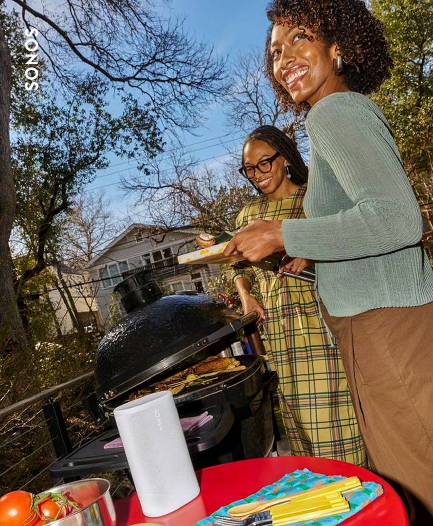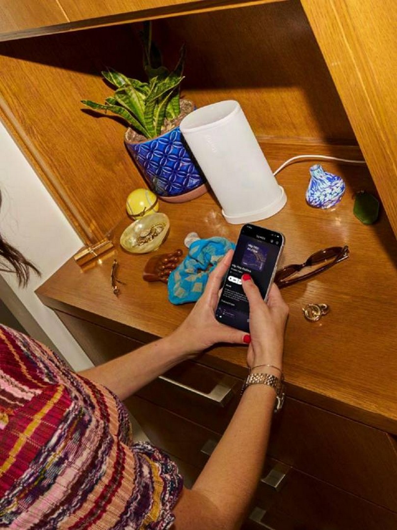 5. Ta systemet ditt med overalt Når du er borte fra hjemmet, hold inne Play/Pause på en andre Sonos Play eller Move 2 som er lagt til i systemet ditt for å gruppere dem uansett hvor du er.