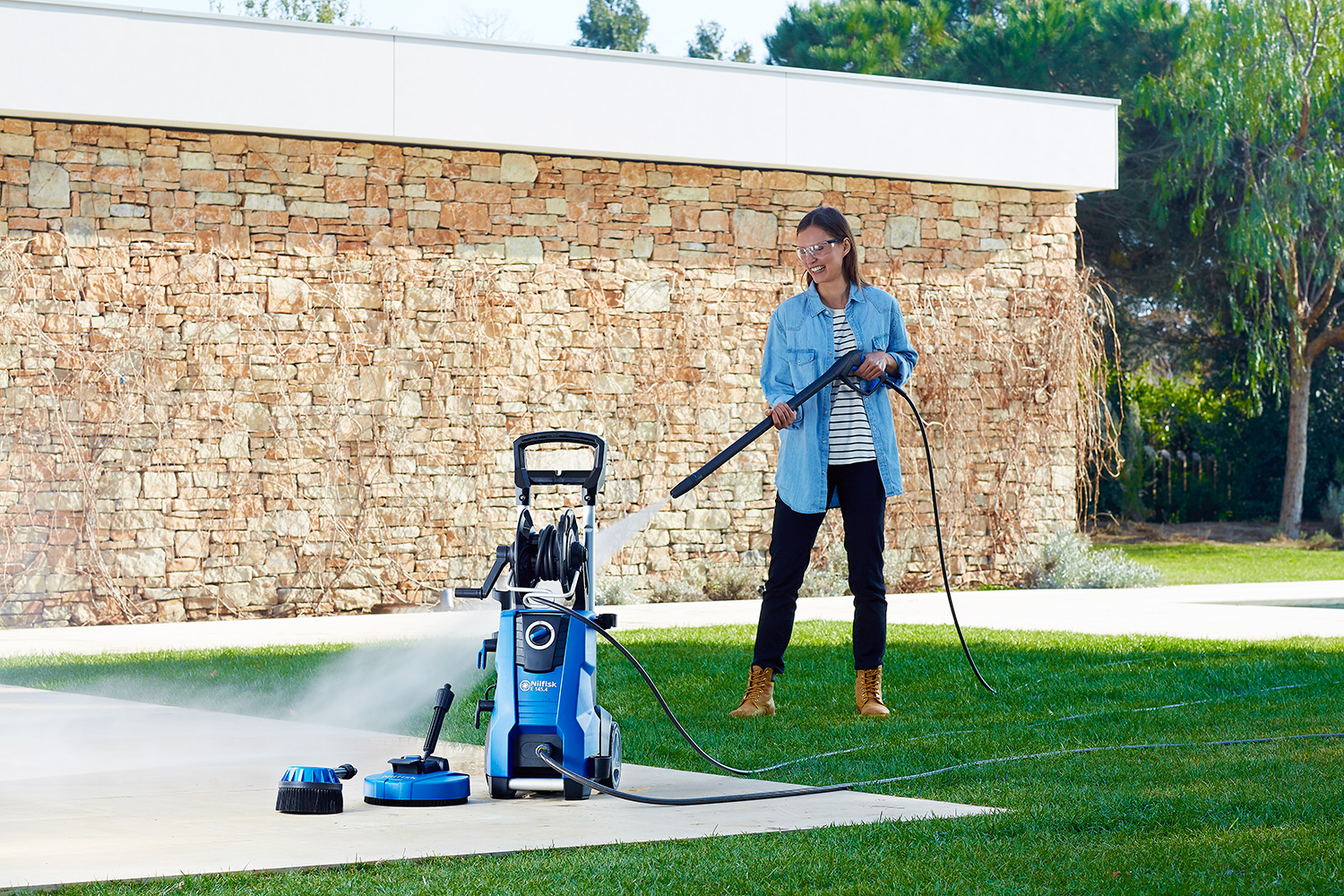Maskinen takler alt fra følsomme overflater til mer krevende underlag som uteplasser, steinlegging og fasader. Takket være Click&Clean-systemet bytter du raskt tilbehør og tilpasser maskinen etter oppgaven – slik at du alltid får riktig kraft der det trengs.