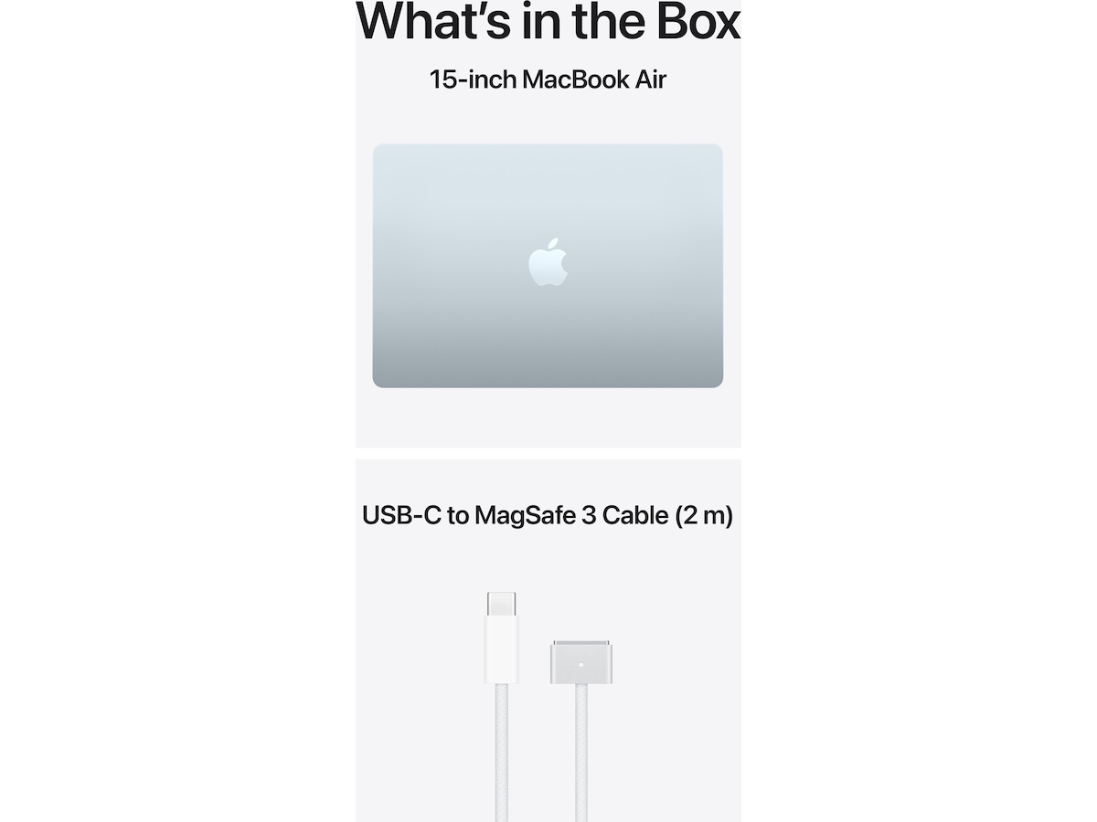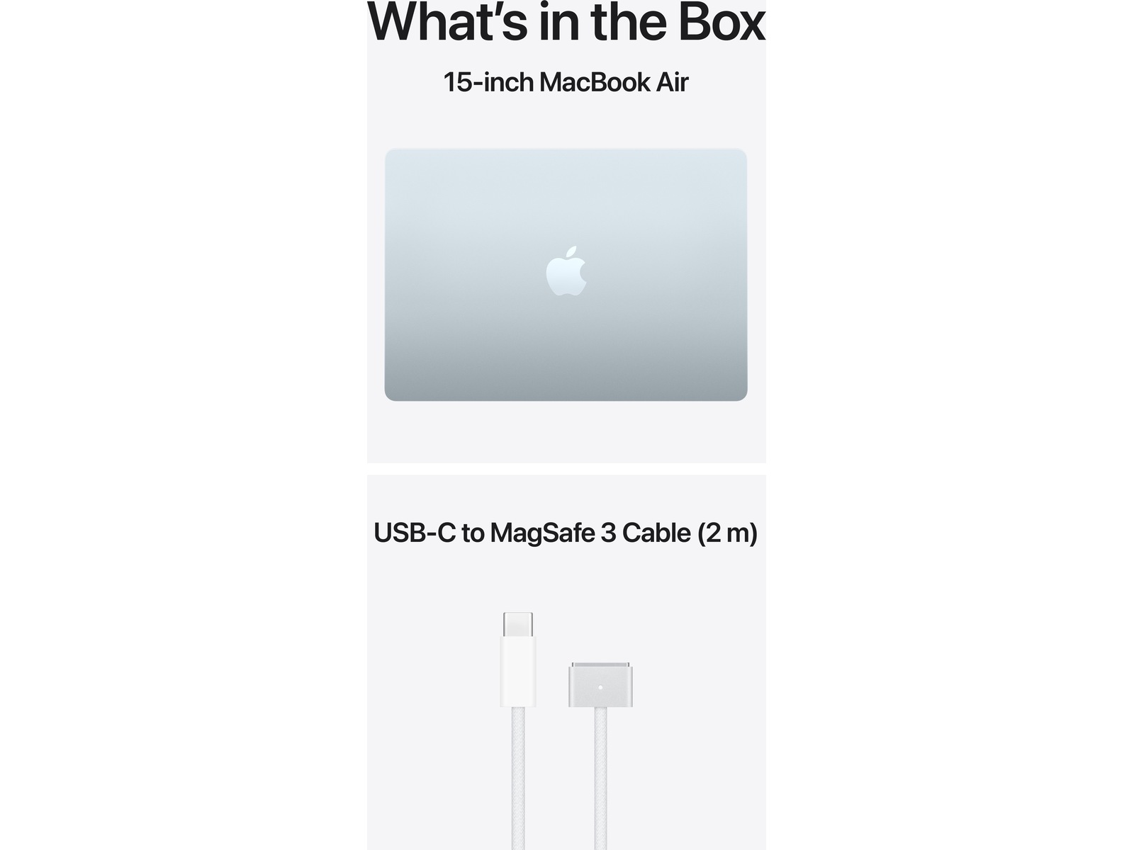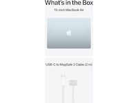 LADERE – Vær oppmerksom på følgende: 15-tommers MacBook Air leveres med en USB-C-til-MagSafe 3-ladekabel, men lader følger ikke med. En USB-C-lader eller andre USB-hurtigladere som kan yte 35 watt eller høyere, kreves for å lade denne enheten. For optimal lading anbefaler Apple å sammenkoble denne Macen med en 35-watts USB-C-lader med to porter fra Apple eller 70-watts USB-C-laderen for å dra nytte av hurtigladingen (lading opptil 50 prosent på 35 minutter).(7)