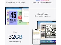 KOBLE TIL ALT – MacBook Air har to Thunderbolt 4-porter, en MagSafe-ladeport, en hodetelefon-utgang – samt Apple N1-chipen for trådløs tilkobling for Wi-Fi 7(4) og Bluetooth 6. Og den støtter opptil to eksterne skjermer.