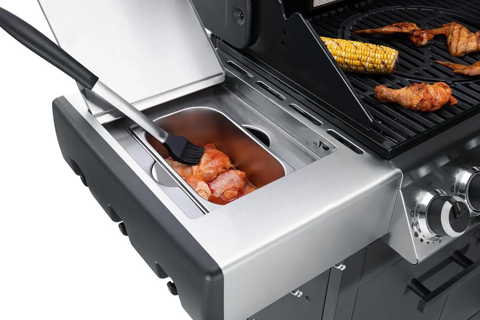 Grillen har sidebord som du kan bruke til tilberedning eller avlasting. I det ene sidebordet er det integrert en marinadebeholder der du kan tilberede mat i marinade. Det andre sidebordet har en keramisk sidebrenner der du for eksempel kan koke poteter eller steke annet tilbehør.
