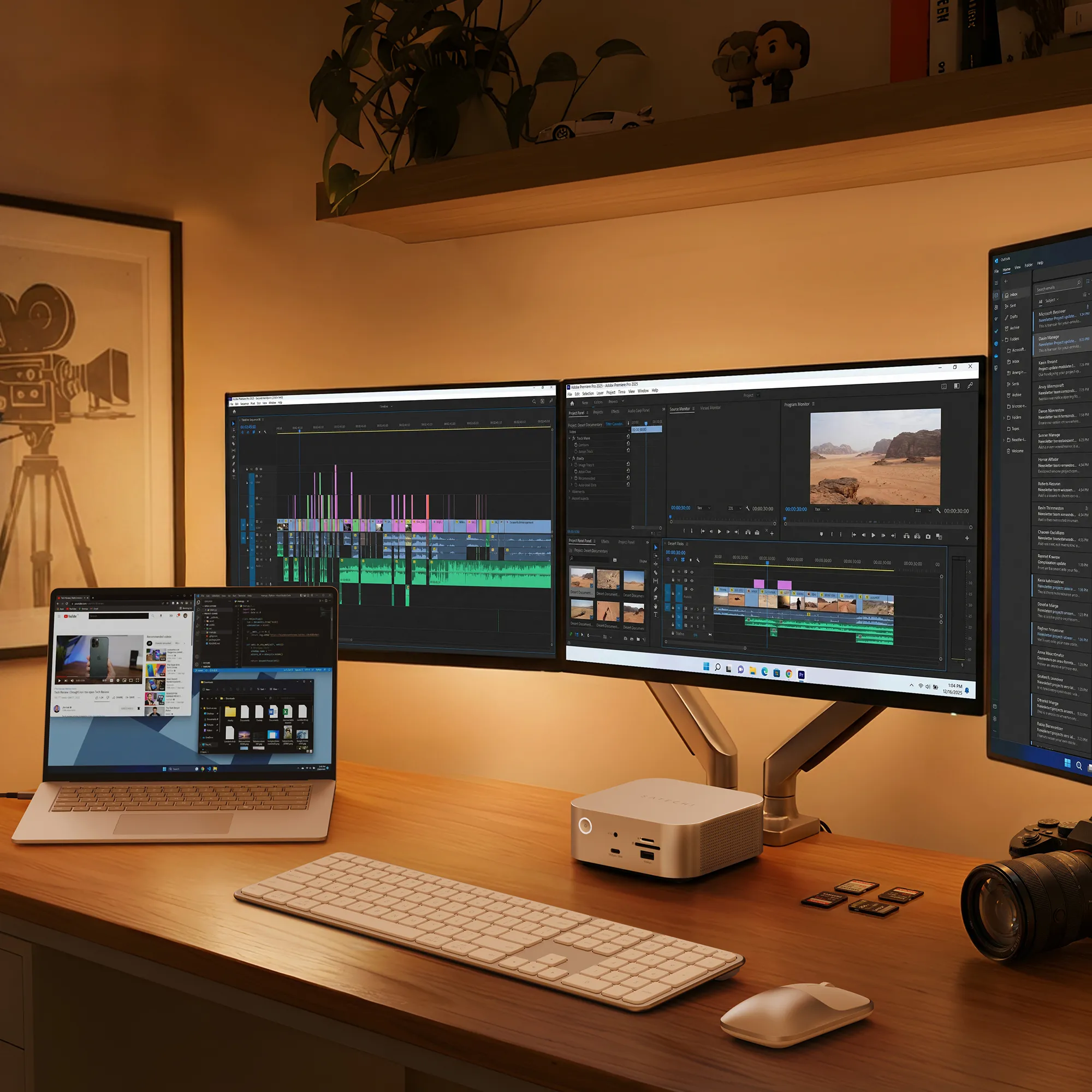 Profesjonelle porter inkludert 2.5Gb Ethernet, UHS-II SD og microSD, og 10Gbps USB Koble til kameraer, kortlesere, kablede nettverk, hodetelefoner og høyhastighets tilbehør gjennom et nøye utvalgt portutvalg. Med 10Gbps USB-A og USB-C, UHS-II SD og microSD, 2.5Gb Ethernet og flere nedstrøms Thunderbolt 5-porter, er CubeDock bygget for å forankre et moderne skrivebordoppsett i et kompakt aluminiumskabinett med aktiv kjøling.