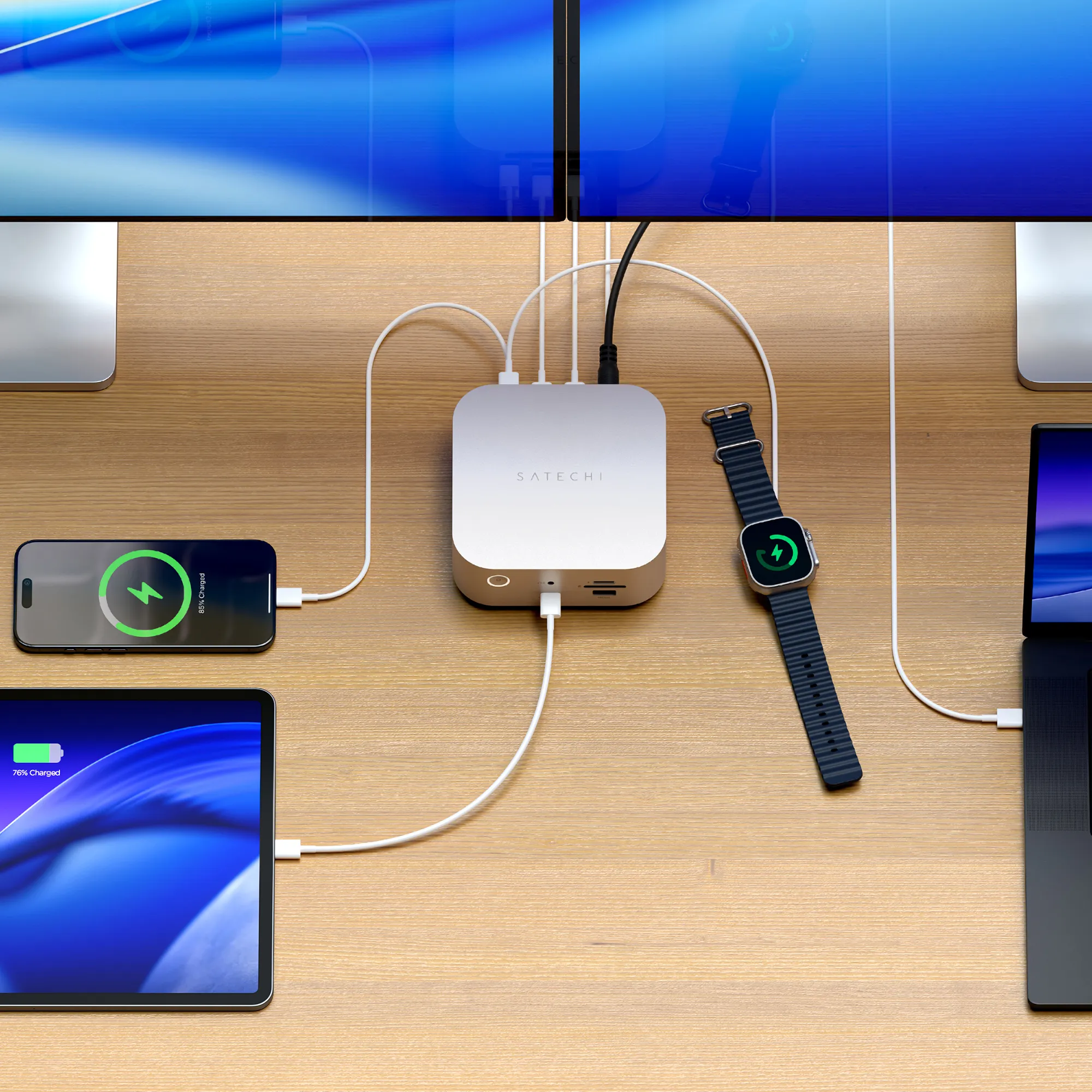 Gjør skrivebordet ditt om til en strømlinjeformet, høyytende arbeidsstasjon med Satechis Thunderbolt 5 CubeDock. Med én enkelt kabel kan du koble til flere høyoppløselige skjermer, overføre store filer med full Thunderbolt-hastighet, legge til rask NVMe-lagring og lade den bærbare PC-en din med opptil 140W strømforsyning.