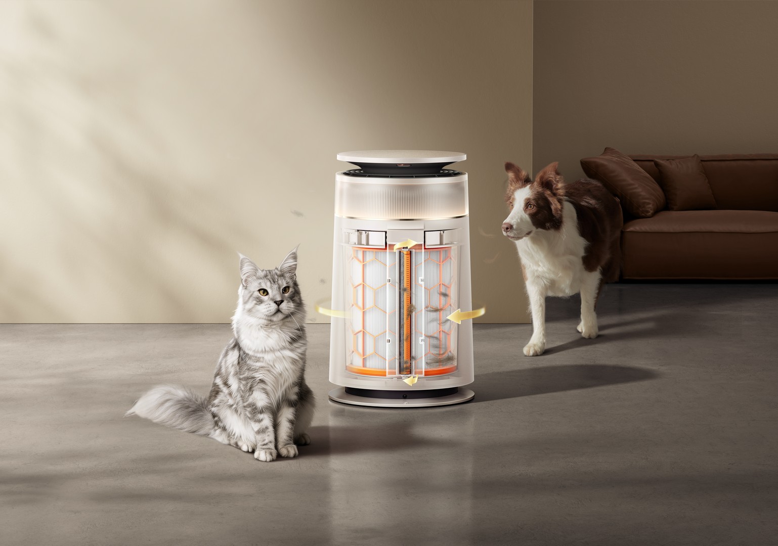 Dreame FP10 luftrenser fanger opp til 99,9 % av hår og pels med sitt selvrengjørende filter og H14-filtrering, perfekt for hjem med kjæledyr.