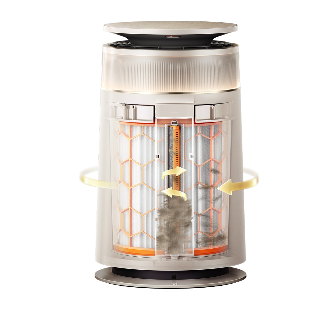 For å forhindre at hår setter seg fast i forfilteret og reduserer luftstrømmen over tid, bruker FP10 et selvrengjørende system. Et 360° roterende filter arbeider sammen med en børste som er i konstant kontakt med filteroverflaten og samler opp hår og større partikler. Det oppsamlede materialet overføres til et oppsamlingskammer, noe som forhindrer tetting og hjelper luftrenseren med å opprettholde ytelsen. Den selvrengjørende funksjonen justerer seg også automatisk basert på luftkvalitet og valgt driftsmodus. For husholdninger med kjæledyr betyr dette mindre vedlikehold, færre manuelle inngrep og en luftrenser som fortsetter å fungere effektivt selv under høy belastning.