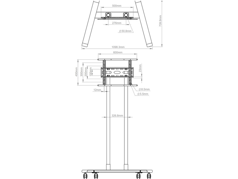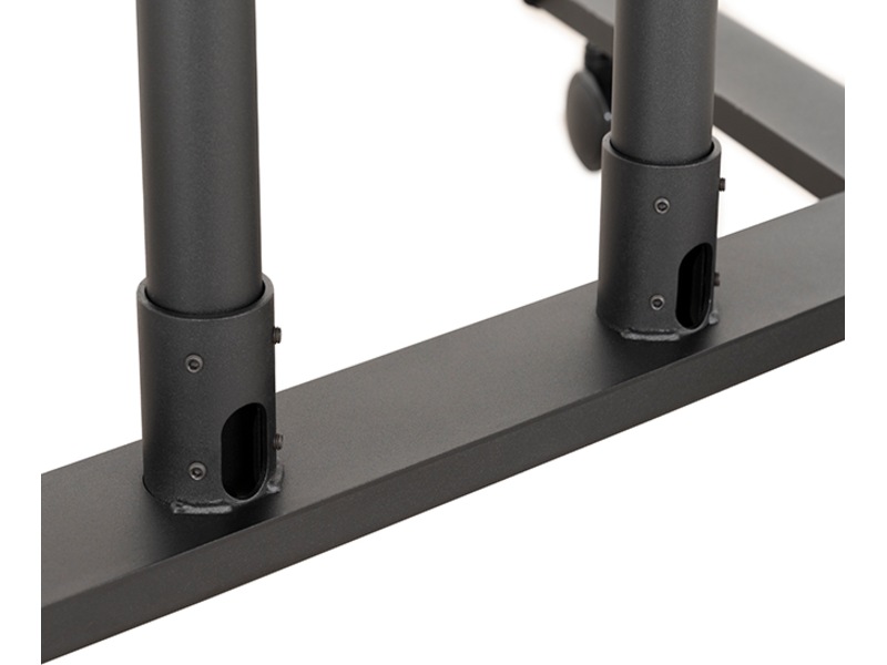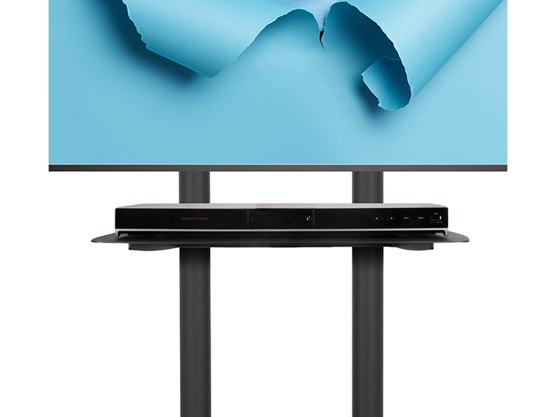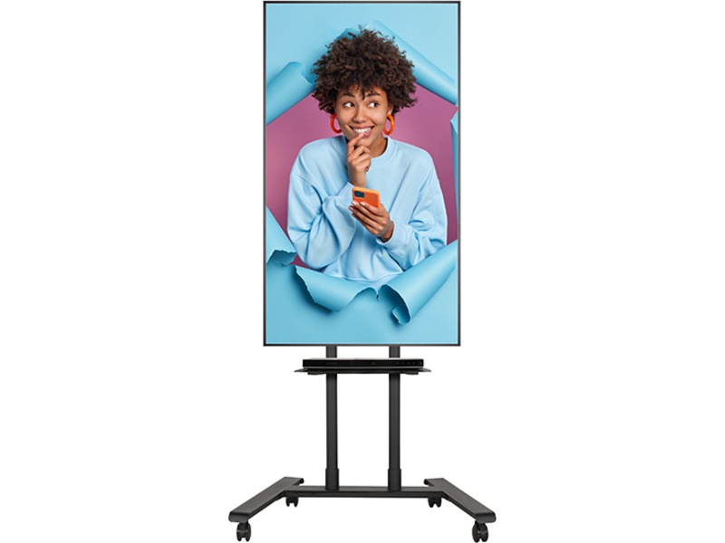 Hjul med lås og valgfrie justerbare nivelleringsføtter er inkludert for bruk som enten bærbar eller frittstående løsning. Universell utforming som egner seg for skjermer i stående eller liggende stilling