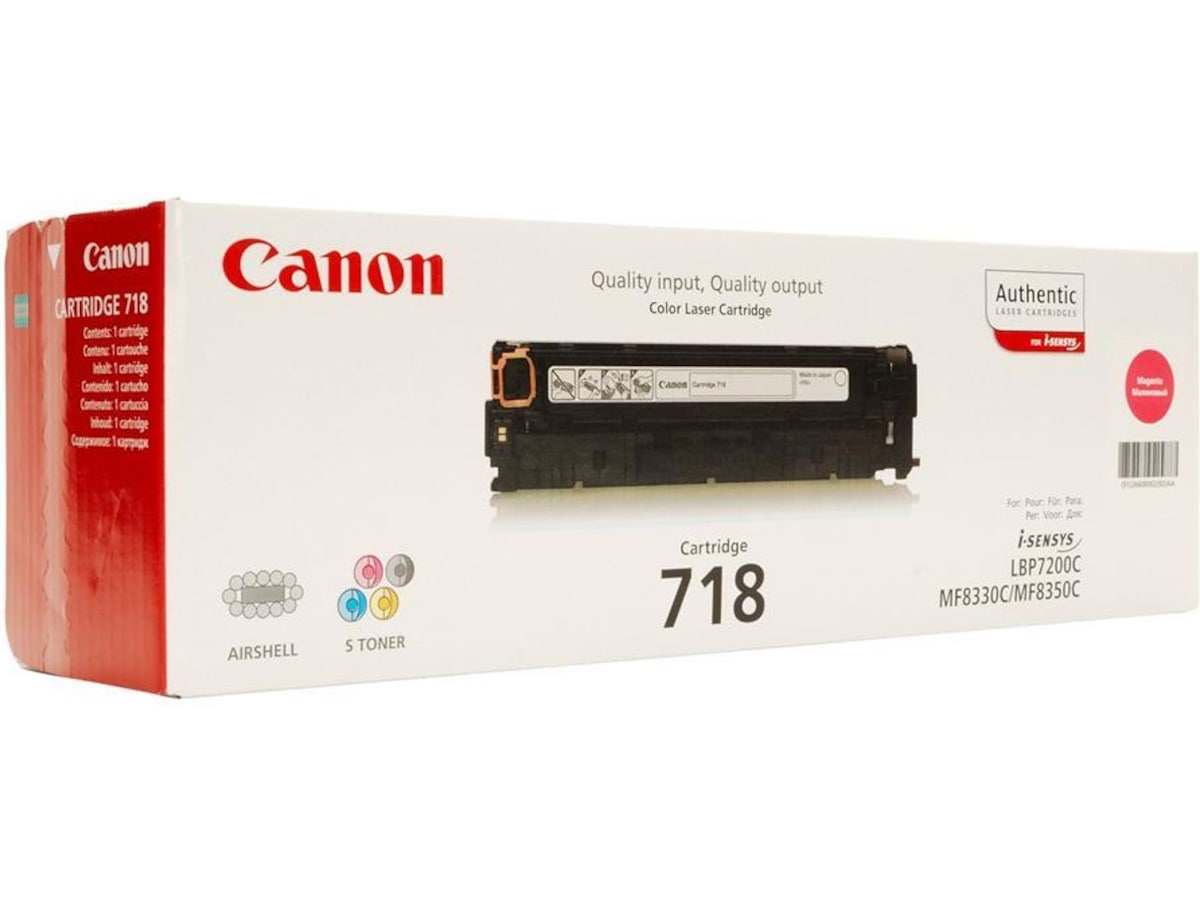 - Denne magenta Canon 718-toneren gir svært god utskriftskvalitet med klare farger og skarpe konturer - Tonerkassetter fra Canon er laget for å gi best mulige utskrifter med Canon-skrivere - De gir flekkfrie utskrifter som holder lenge - Programmet for resirkulering av tonerkassetter gjør det lett å kvitte seg med brukt toner på en miljøansvarlig måte - Kapasitet ca. 2 900 sider - For bruk med: i-SENSYS LBP7210, LBP7660, LBP7680, MF8340, MF8350, MF8360, MF8380, MF8540, MF8550, MF8580