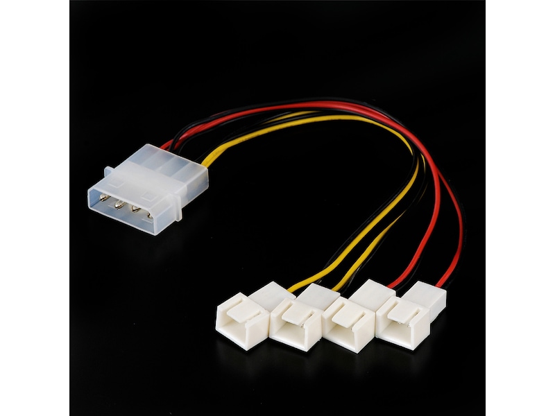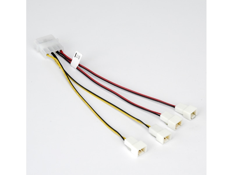 4-pins Molex PSU til fire 3-pinsvifter med hastighetsreduksjon. To +12 V-kontakter og to +5 V-kontakter, fargekodet, lengde: 15 cm