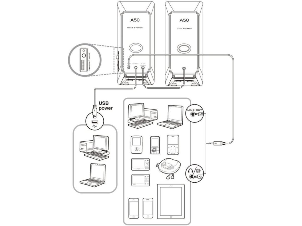 Kablet fjernkontroll for å slå PÅ/AV og justere volumet enkelt. Produkt: Produktbeskrivelse: CREATIVE A50 2.0 SPEAKER USB BLACK SYS SPKR A50 CLE-R N BK Beskrivelse: Creative A50 - Høyttalere - for PC - svart EAN-Kode: 5390660184673 Produsentens garanti: 24 måneder - Bring-In Warranty  Generelt Produkttype: Høyttalere - for PC Egenskaper: Bassrefleks Eksteriørfarge: Svart  Høyttalersystem Systemkomponenter: 2 høyttalere Høyttalertype: Aktiv Magnetskjold: Ja Forsterker: Integrert Kontroller: Strøm på/av, volum  Koblinger Koplingstype: Lydinngang (minijack stereo 3,5 mm)  Strømforsyning Strømkildetype: AC-strømadapter Alternativer: USB-drevet  Mål og vekt Dimensjoner (BxDxH) / vektdetaljer: Høyttaler for venstre kanal: 7.4 cm x 8.3 cm x 16.3 cm / 239 g