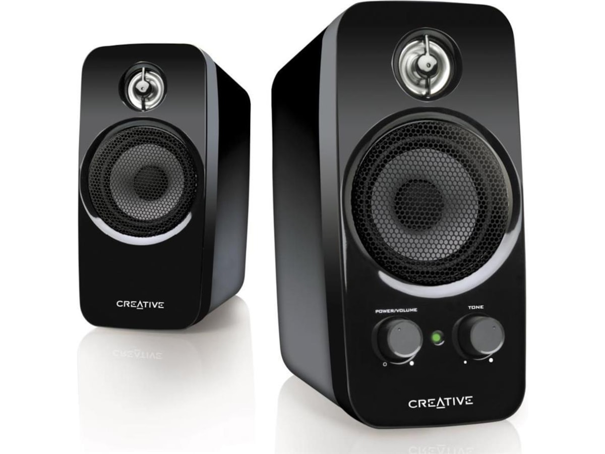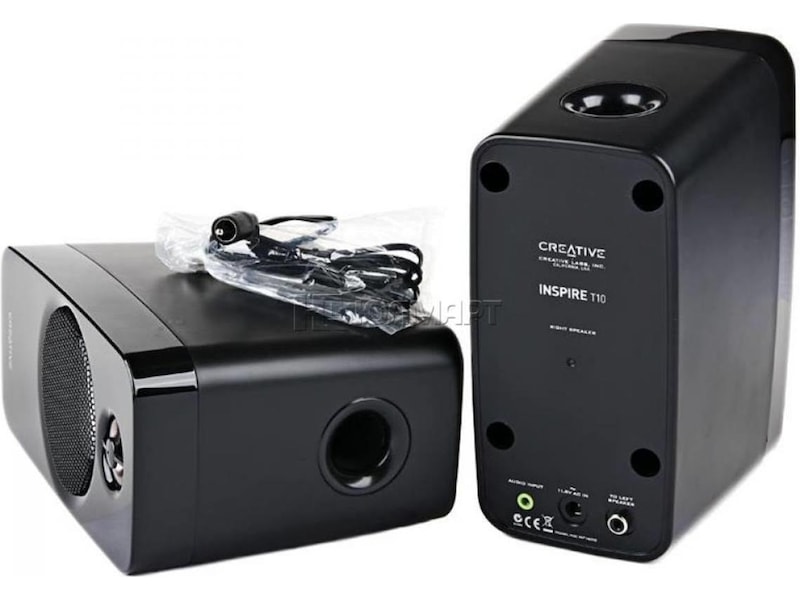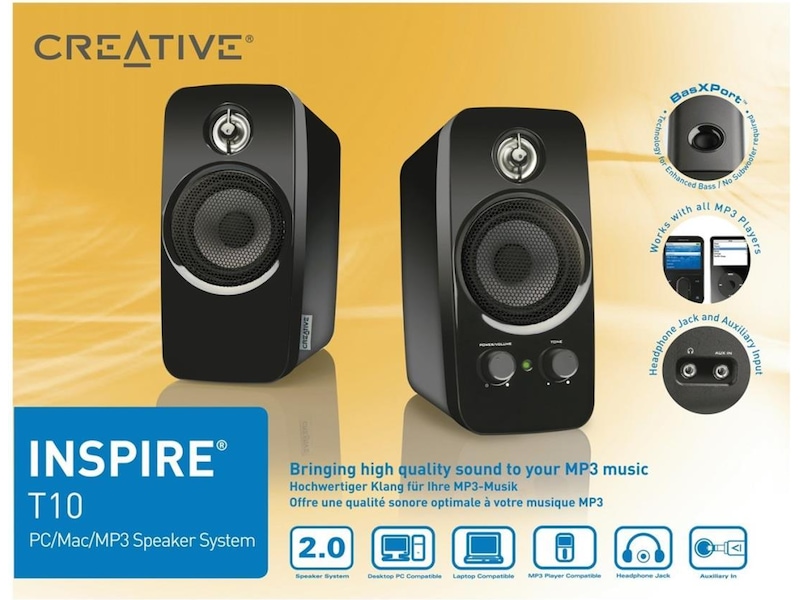 Beskrivelse Creative Inspire T10-høyttalerne gir lyd av høy kvalitet for all digital musikk. De er kompakte og slanke, i glanset svart og kombinerer avansert ingeniørkunst med et flott utseende for å gi bedre lyd fra stasjonære og bærbare PCer og MP3-spillere. De skaper et ekte hifi-lydbilde med separate diskantelementer for høyfrekvent perfeksjon, presisjonselementer for det mellomfrekvente området og BasXPort -teknologi for kraftig lavfrekvent lyd uten subwoofer. Separate volum- og basskontroller muliggjør optimal avspilling av alle typer musikk, og takket være deres magnetiske skjerming kan du plassere Inspire T10-høyttalerne nær PC- og TV-skjermer. De har en hodetelefonkontakt for privat lytting.