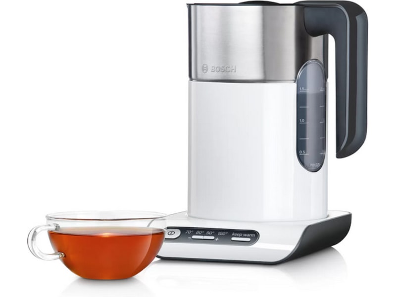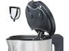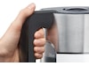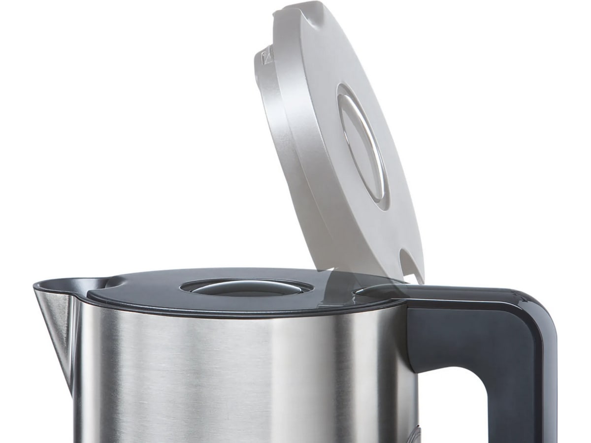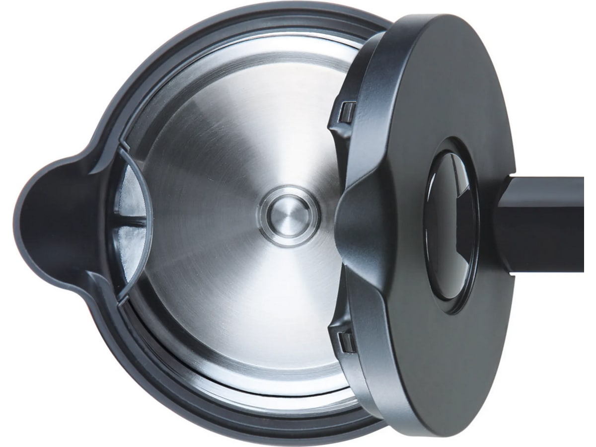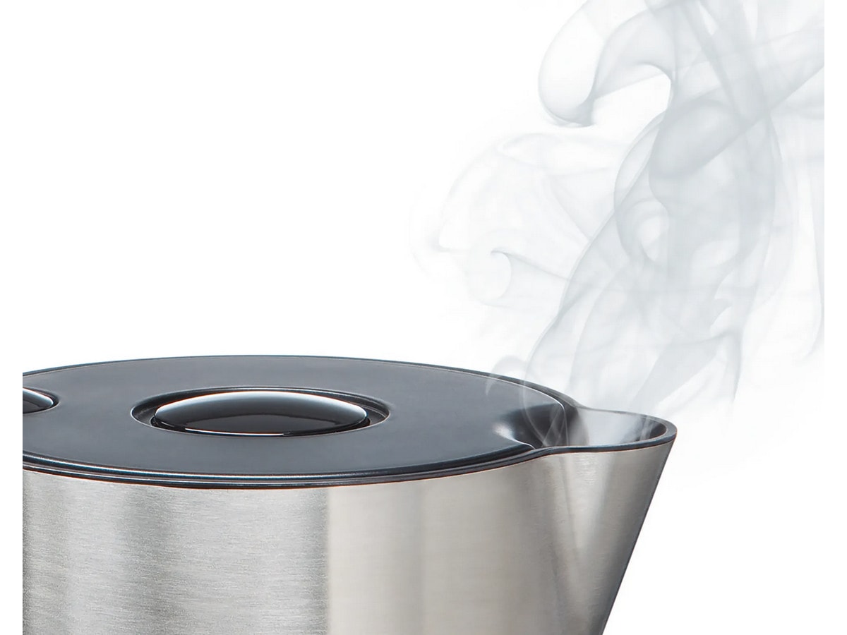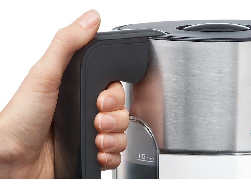 For 1.5 l vann Effekt: 2000-2400 W maks. Kabelfri, 360º sokkel Bunn i rustfritt stål med skjult element Utvendig indikator for vannivå på begge sider Dekselåpning ved tastetrykk Dampstopp-automatikk: slås automatisk av når kokepunkt er oppnådd Sikkerhet - starter kun med lokket på Uttakbart kalkfilter av rustfritt stål Overopphetningbeskyttelse Kabeloppkveiling