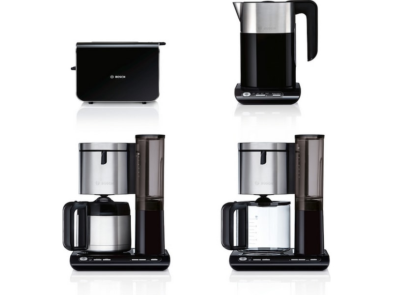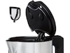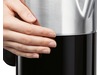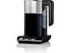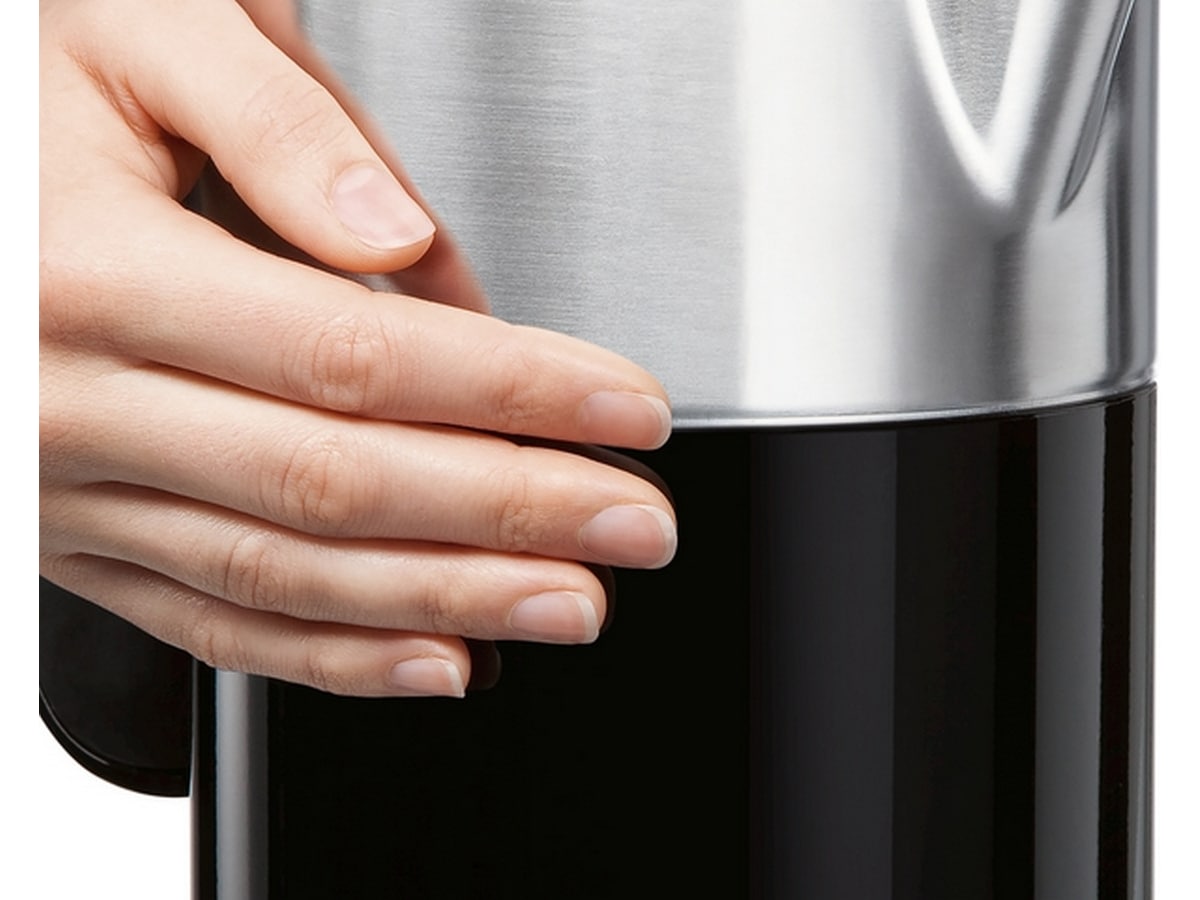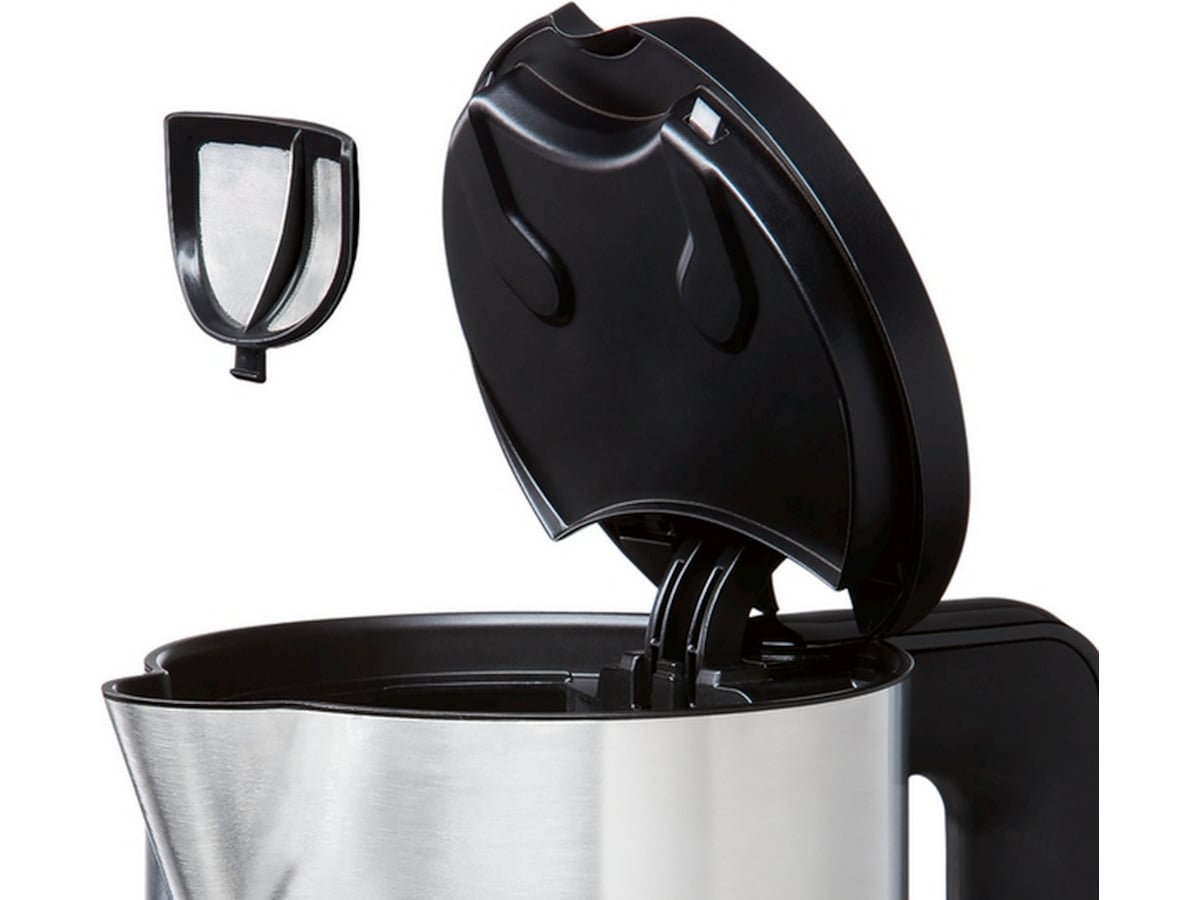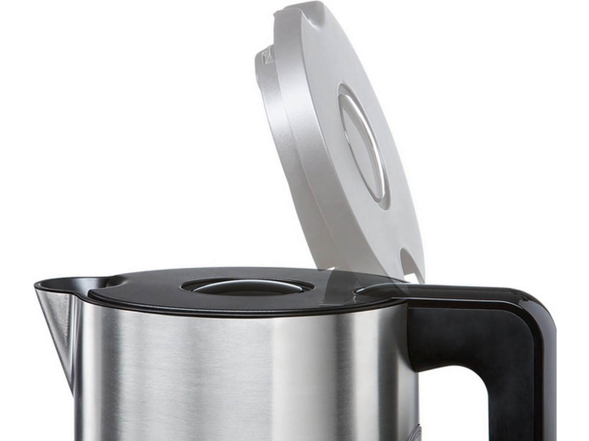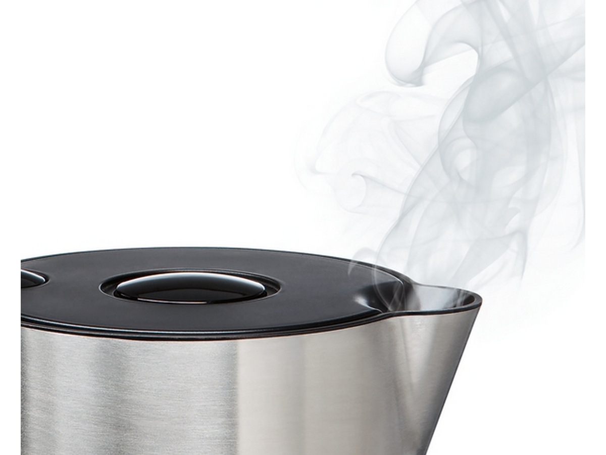 For 1.5 l vann Effekt: 2000-2400 W maks. Kabelfri, 360º sokkel Bunn i rustfritt stål med skjult element Utvendig indikator for vannivå på begge sider Dekselåpning ved tastetrykk Dampstopp-automatikk: slås automatisk av når kokepunkt er oppnådd Sikkerhet - starter kun med lokket på Uttakbart kalkfilter av rustfritt stål Overopphetningbeskyttelse Kabeloppkveiling