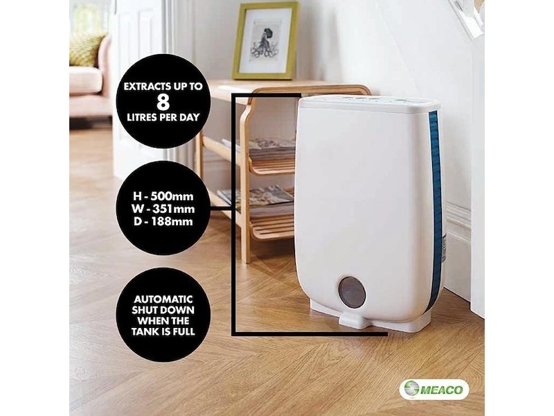 - Kan fjerne 8 liter om dagen, noe som tilsvarer en 16 eller 20 liters kompressorbasert avfukter