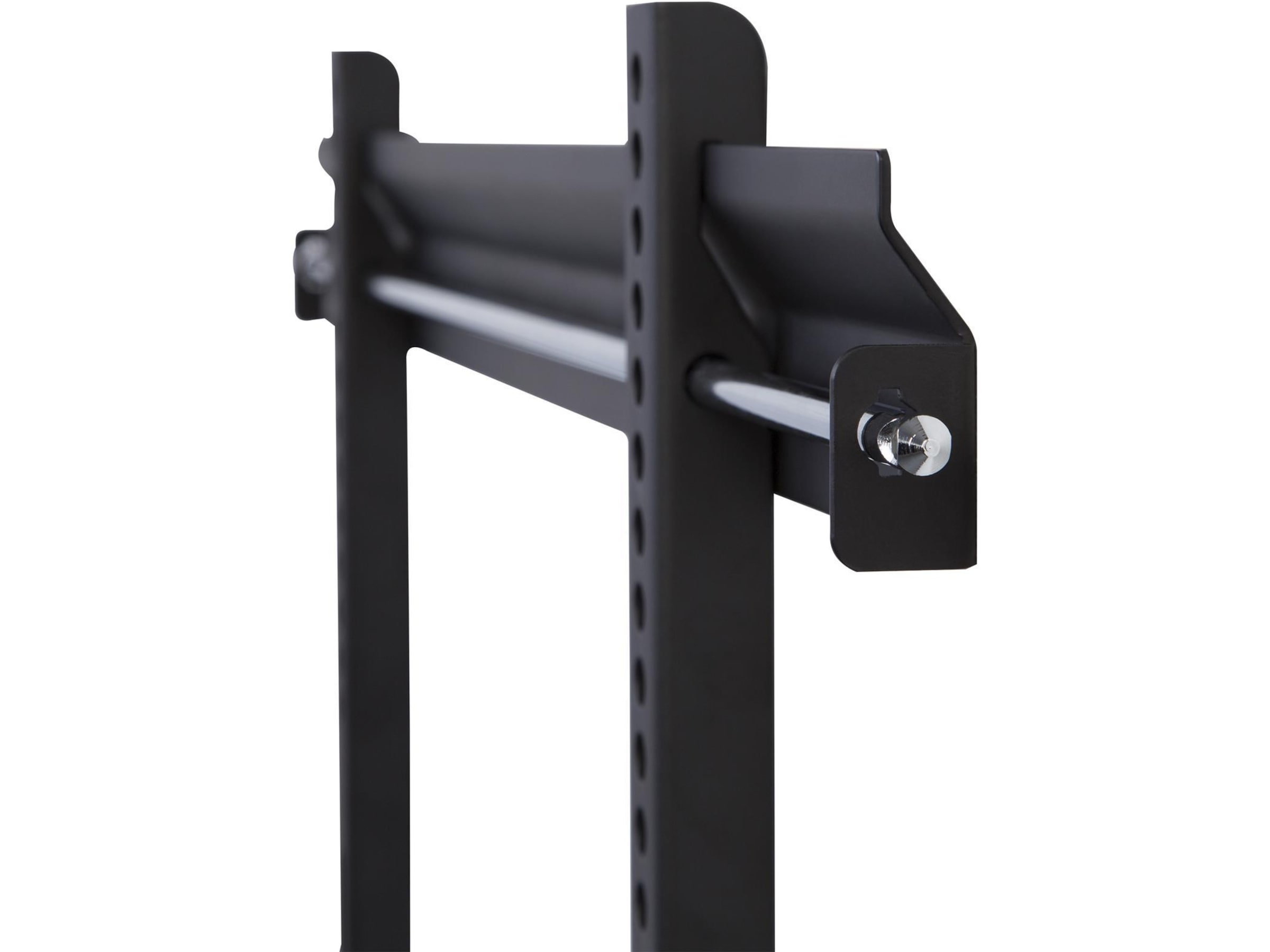- Tre låsepinnen gjennom hullet på siden av veggskinnen, gjennom monitorfestene og ut på andre siden av veggskinnen. Roter låsepinnen for å sikre pinnens posisjon. Kan eventuelt låses med hengelås for økt barnesikkerhet.