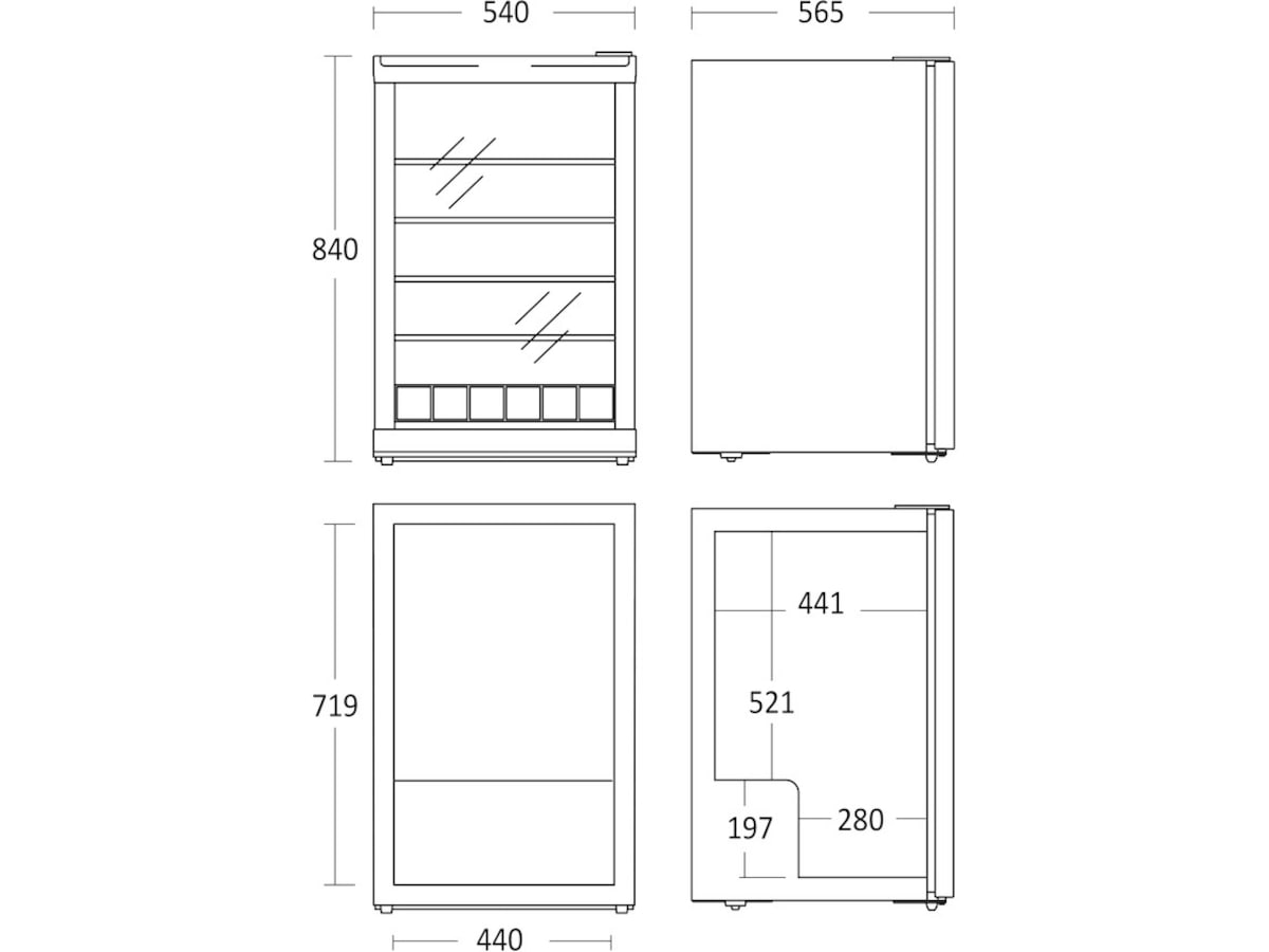 Kjøleskapet er utstyrt med 4 justerbare trådhyller, som monteres på avstand slik at det er plass til å fylle skapet med både flasker, bokser og mat. Nederst er det en trådhenger, som hindrer f.eks. frukt i utrulling. Bøylen kan enkelt tas av. LED-belysning gir et fint lysfall i det sorte kjølerommet.