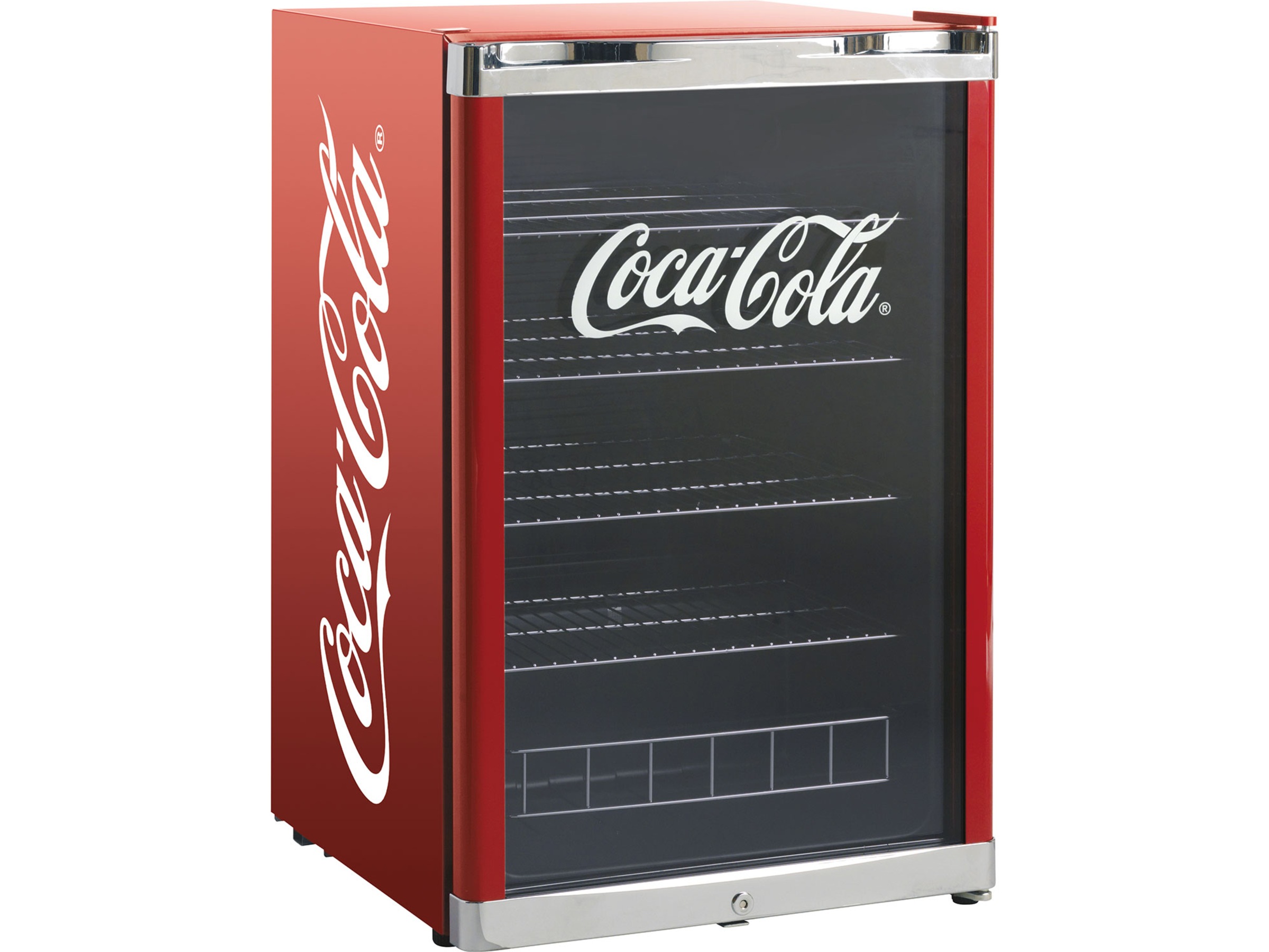Scandomestic High Cube er på størrelse med andre små kjøleskap, bare med det nostalgiske Coca Cola-designet, den klassiske røde Coca Cola-fargen, med den hvite Coca Cola-logoen på sidene og på glassdøren. Kjøleskapet har et elegant, integrert kromhåndtak som fullfører utseendet til det stilige kjøleskapet.